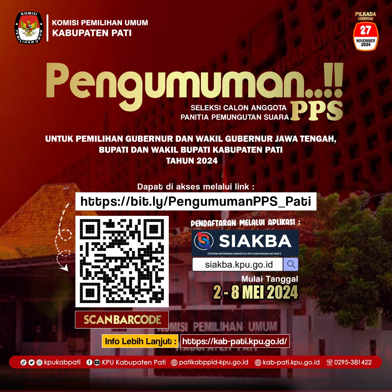 Komisi Pemilihan Umum Kabupaten Pati mengundang Warga Negara Indonesia yang memenuhi kualifikasi untuk mendaftarkan diri menjadi Panitia Pemungutan Suara untuk Pemilihan Gubernur dan Wakil Gubernur, Bupati dan Wakil Bupati, dan Wali Kota dan Wakil Wali Kota.