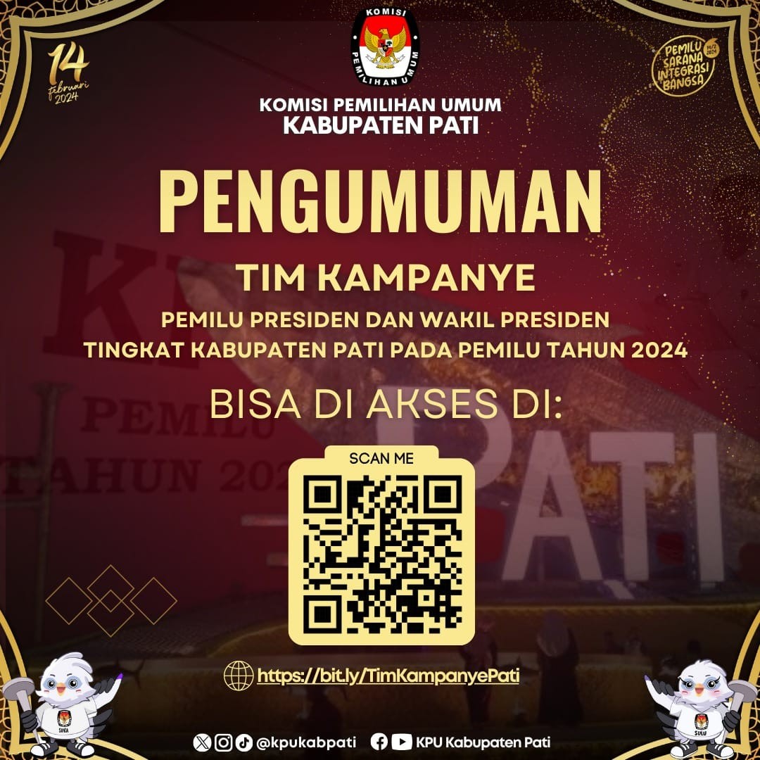 Pengumuman Tim Kampanye Pemilu Presiden dan Wakil Presiden tingkat Kabupaten Pati pada Pemilu 2024 sudah dapat kamu akses di https://bit.ly/TimKampanyePati atau melalui scan qrcode dalam gambar ya!
