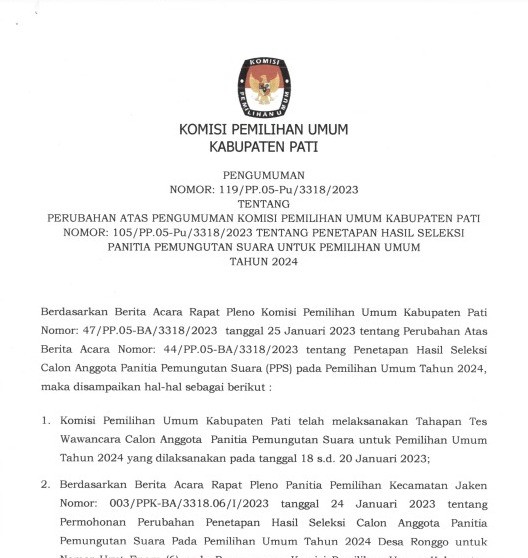 berikut kami sampaikan Pengumuman Nomor: 119/PP.05-Pu/3318/2023 Tentang Perubahan Atas Pengumuman Komisi Pemilihan Umum Kabupaten Pati Nomor: 105/PP.05-BA/3318/2023 Tentang Penetapan Hasil Seleksi Panitia Pemungutan Suara Untuk Pemilihan Umum Tahun 2024