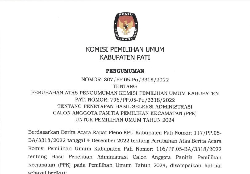 Berikut Perubahan Pengumuman KPU Kabupaten Pati Nomor: 796 / PP.05-Pu/3318/2022