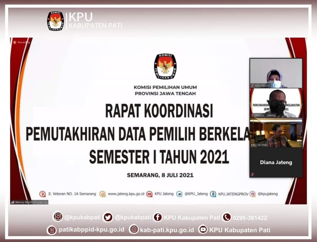 Hari ini, Kamis (8/7) KPU Kabupaten Pati mengikuti Rapat Koordinasi Pemutakhiran Data Pemilih Berkelanjutan yang diselenggarakan oleh KPU Provinsi Jawa Tengah. Rapat Koordinasi ini digelar secara virtual sebagai salah satu upaya KPU untuk secara aktif turut serta dalam pencegahan dan memutus mata rantai penyebaran Covid-19 yang mengalami lonjakan sangat signifikan dalam beberapa pekan terakhir ini.