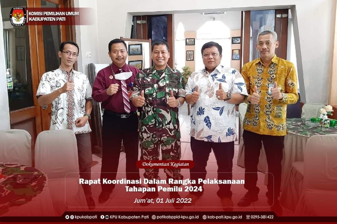Ketua KPU dan Anggota Divisi Teknis, dan Divisi Soisialisasi beserta Sekretaris melaksanakan Rapat Koordinasi dalam Rangka Pelaksanaan Tahapan Pemilu 2024. Kegiatan berlangsung bertempat di Kodim 0718 Pati. (1/7)