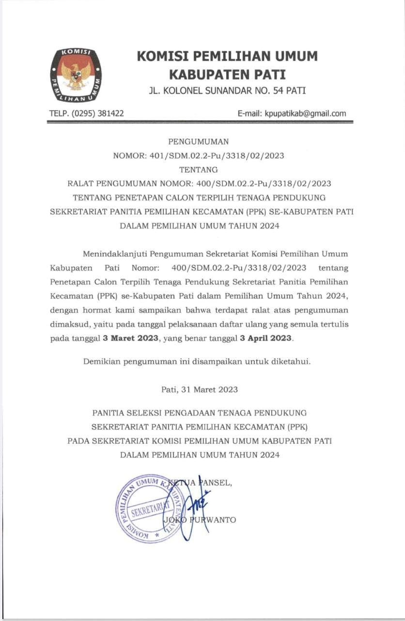 Berikut kami informasikan Rapat Pengumuman Nomor:400/SDM.02.2-Pu/3318/02/2023 Tentang Penetapan Calon Terpilih Tenaga Pendukung Sekreatariat Panitia Pemilihan Kecamatan (PPK) se-Kabupaten Pati dalam Pemilihan Umum Thun 2024