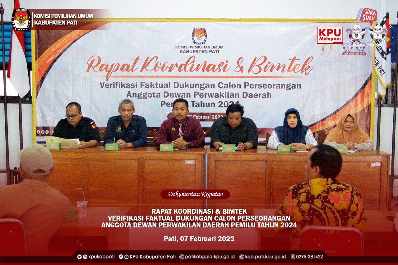 KPU Kabupaten Pati melaksanakan Rapat Koordiansi Verifikasi Faktual Dukungan Calon Perseorangan Anggota Dewan Perwakilan Daerah Pemilu Tahun 2024, KPU Kabupaten Pati melaksanakan Bimbingan Teknis kepada Panitia Pemilihan kecamatan se-kabupaten Pati untuk tahapan verifikasi Faktual Calon Perseorangan Dewan Perwakilan Daerah Pemilihan Umum tahun 2024 untuk Provinsi Jawa Tengah.