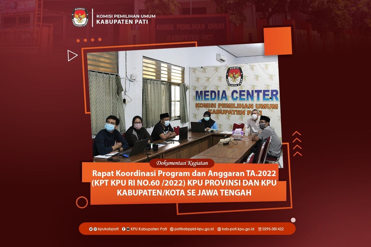 KPU Kabupaten Pati mengikuti kegiatan Rapat Koordinasi Anggaran DIPA TA. 2022 dan Tindak Lanjut Keputusan KPU RI Nomor 60 Tahun 2022 Tentang Petunjuk Teknis Pelaksanaan Program dan Kegiatan Daftar Isian Pelaksanaan Anggaran Komisi Pemilihan Umum Provinsi/Komisi Independen Pemilihan Aceh dan Komisi Pemilihan Umum/Komisi Independen Pemilihan Kabupaten/Kota Bagian Anggaran 076 Tahun Anggaran 2022.