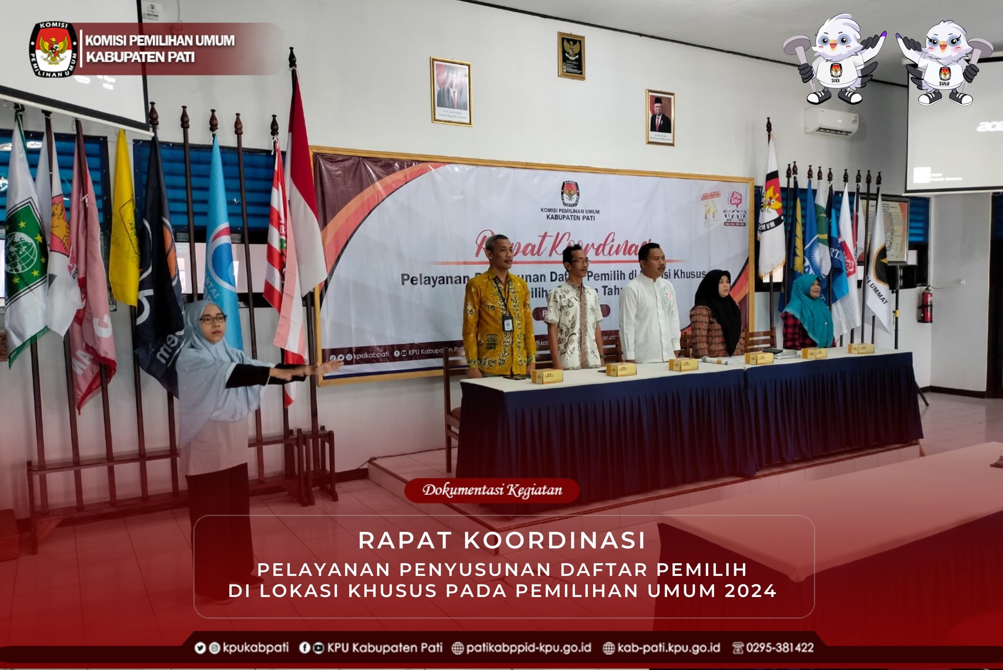 KPU Kabupaten Pati melaksanakan Rapat Koordinasi Pelayanan Penyusuanan Daftar Pemilih di Lokasi Khusus pada Pemilihan Umum Tahun 2024, Hari Jumat 10 Maret 2023 Pukul 09.00 WIB.