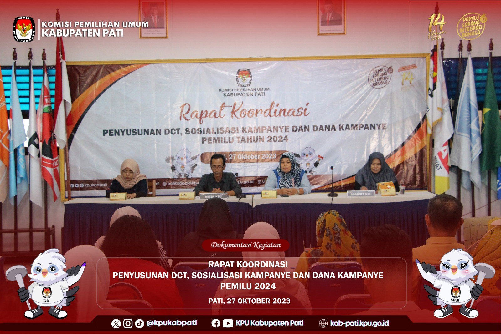 KPU Kabupaten Pati menyelenggarakan Rapat Koordinasi Penyusunan DCT, Sosialisasi Kampanye dan Dana Kampanye Pemilu 2024. Rakor dihadiri seluruh perwakilan Ketua, Sekretaris dan Admin Partai Politik Se-Kabupaten Pati dan Bawaslu Pati.