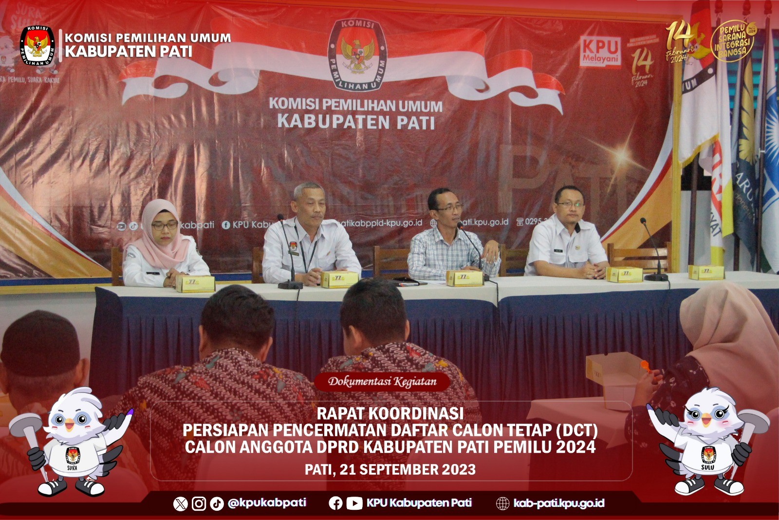 KPU Kabupaten Pati mengadakan Rapat koordinasi Persiapan Pencermatan Daftar Calon Tetap ( DCT) Calon anggota DPRD Kabupaten Pati Pemilu 2024. Rapat yang dilakukan di Aula KPU kabupaten Pati pada hari kamis 21 September 2023 dihadiri perwakilan Partai politik, turut hadir dalam acara tersebut perwakilan Bawaslu Kabupaten pati.