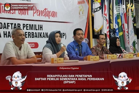 Parpol peserta pemilu 2024 serta ketua dan anggota div perencanaan data dan informasi PPK se-Kab. Pati. Dalam rapat tersebut ditetapkan jumlah pemilih 1.040.246 yg terdiri dari pemilih laki-laki 511.157 dan pemilih perempuan 529.089. Sama seperti setelah penetapan Daftar Pemilih Sementara ( DPS ) pada tgl 5 April 2023 sebelumnya, di tahapan DPSHP ini masy juga diberikan ruang tanggapan dan masukan apabila ada yg belum terdaftar, perubahan status pemilih dll utk menghubungi PPS, PPK atau KPU Kab. Sesuai KPT 27 tahun 2023 tentang Pedoman Teknis Penyusunan Daftar Pemilih Dalam Negeri pada Penyelenggaraan Pemilihan Umum disebutkan bahwa tahapan pengumuman, tanggapan dan masukan atas penetapan DPSHP dilakukan pada tanggal 17 - 23 Mei 2023. Masy bisa aktif cek diri melalui cekdptonline.kpu.go.id
