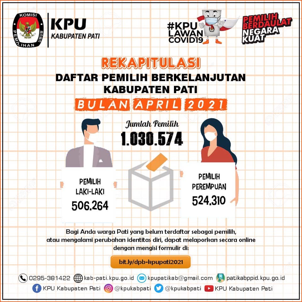 Rekapitulasi Daftar Pemilih Berkelanjutan Kabupaten Pati Bulan April Tahun 2021, dengan jumlah pemilih sebanyak 1.030.574 terdiri dari pemilih laki - laki sebanyak 506.264 dan pemilih perempuan sebanyak 524.310