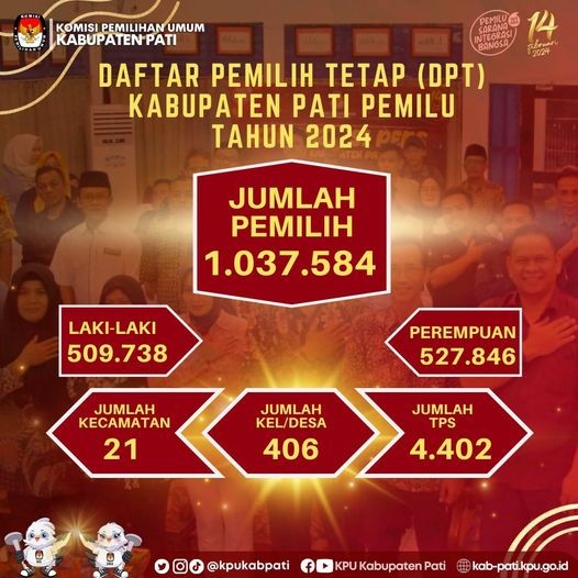 Berikut adalah Rekapitulasi Daftar Pemilih Tetap (DPT) Kabupaten Pati Pemilu Tahun 2024.