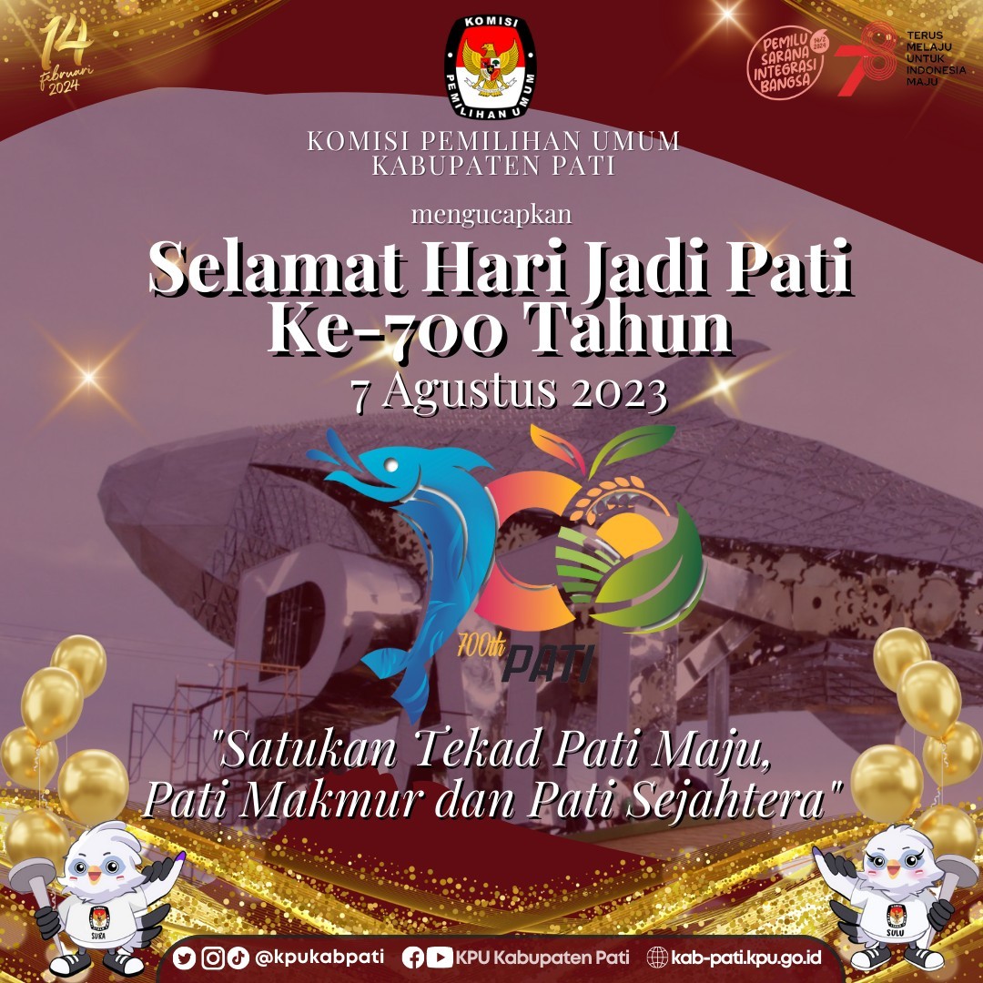 Segenap keluarga besar KPU Kabupaten Pati mengucapkan Selamat Hari jadi Pati ke 700 Tahun pada 7 Agustus 2023.