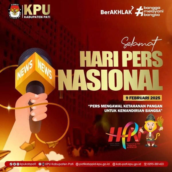 KPU Kabupaten Pati mengucapkan Selamat Hari Pers Nasional, 9 Februari 2025. "Pers Mengawal Ketahanan Pangan untuk Kemandirian Bangsa"