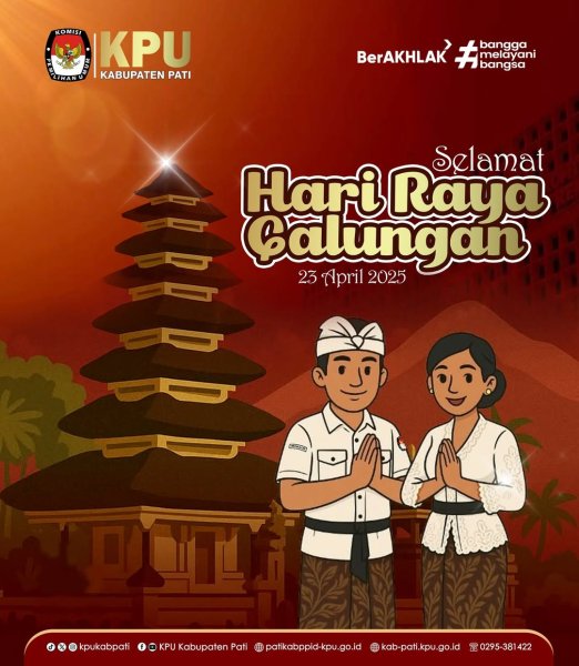 Segenap Jajaran Komisi Pemilihan Umum (KPU) Kabupaten Pati mengucapkan Selamat Hari Raya Galungan bagi umat Hindu di mana pun berada.Semoga kemenangan Dharma atas Adharma membawa damai, kebahagiaan, dan kebaikan bagi kita semua.