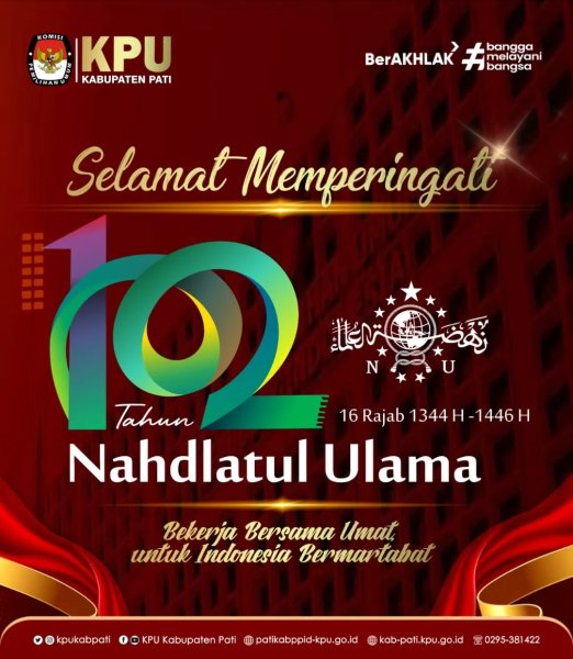 Komisi Pemilihan Umum (KPU) Kabupaten Pati mengucapkan Selamat Memperingati Hari Lahir Nahdlatul Ulama yang Ke-102 Tahun (16 Rajab 1344 H - 1446 H).