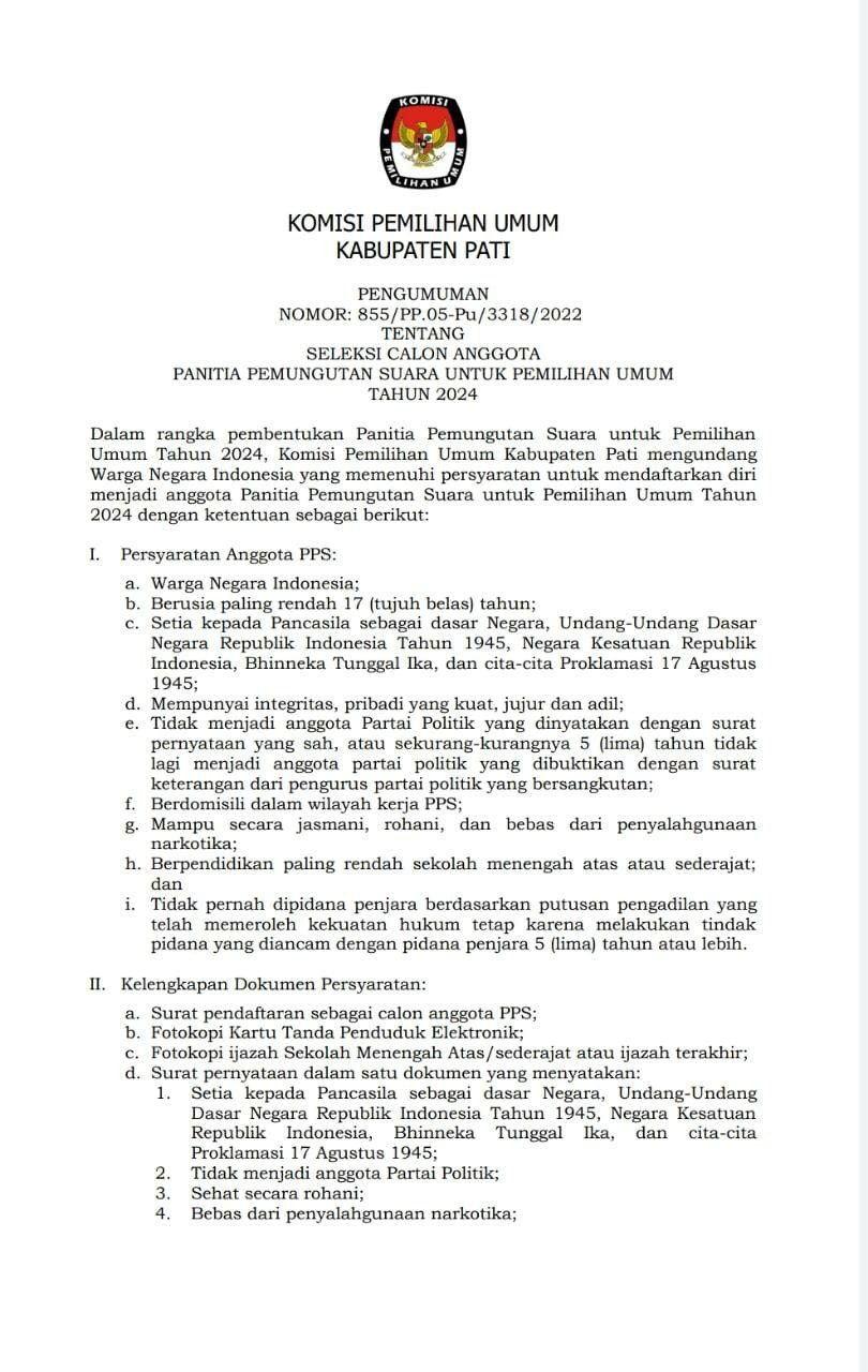 Berikut kami informasikan pengumuman Seleksi Calon Anggota PPS Untuk Pemilu Tahun 2024