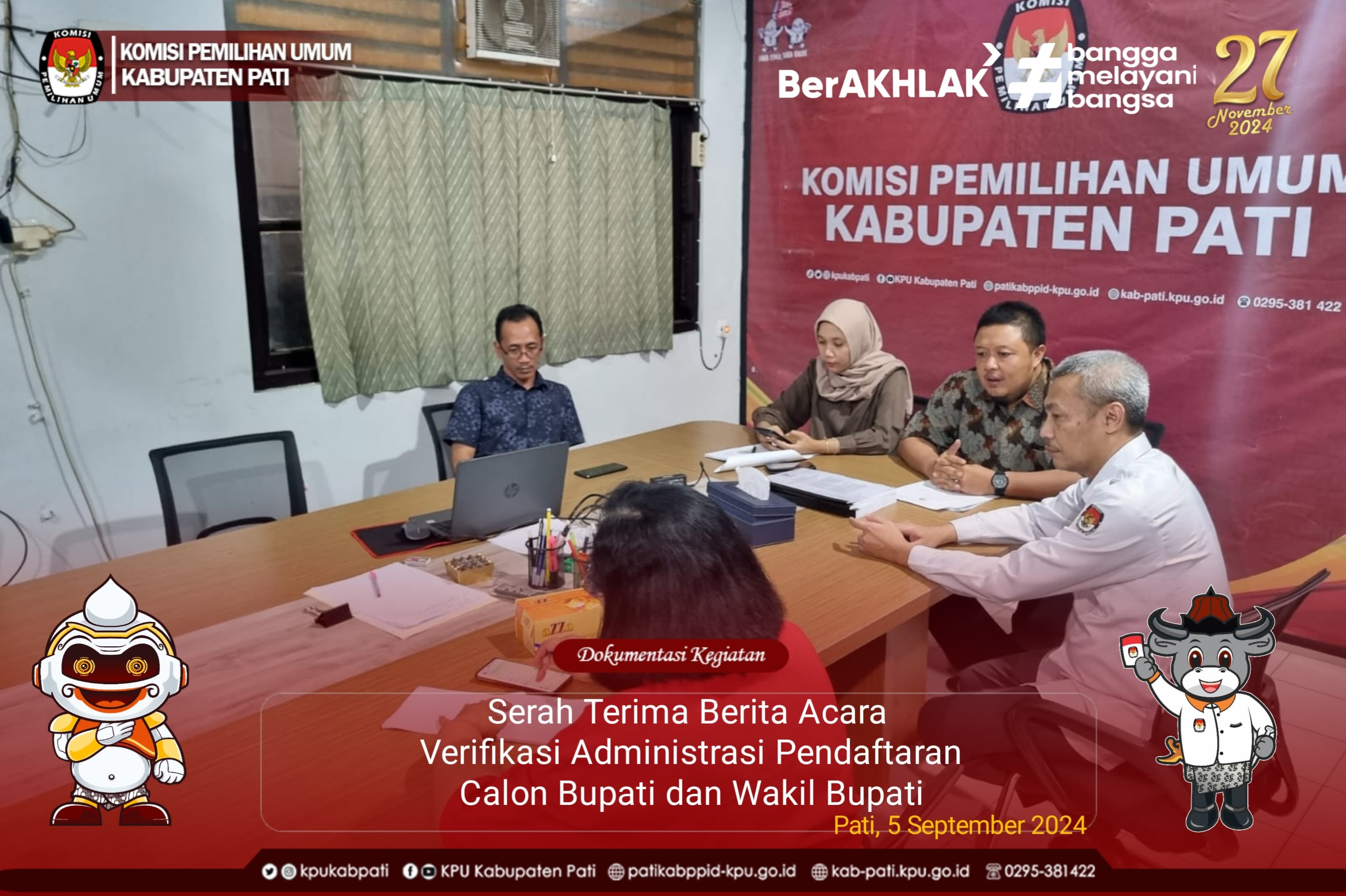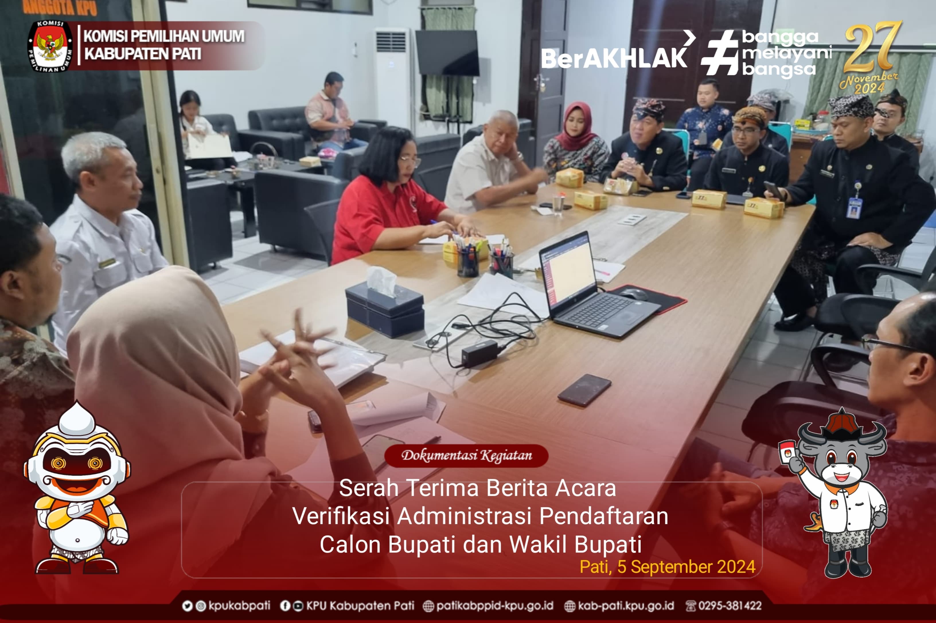 Acara serah terima Berita Acara Hasil Verifikasi Administrasi Pendaftaran Calon Bupati dan Wakil Bupati Pati yang diadakan di Kantor KPU kabupaten Pati mengundang Ketua Tim Sukses pemenangan Pasangan Calon Sudewa, S.T., M.T. - Risma Ardhi Chandra , Ketua Tim Sukses pemenangan Pasangan Calon Wahyu Indriyanto - Suharyono, Ketua Tim Sukses pemenangan Pasangan Calon Budiyono - Novi eko Yulianto, Ketua Desk Pilkada Kabupaten Pati, Kepala Badan Kesbangpol Kabupaten Pati, Ketua Bawaslu Kabupaten Pati, Kepala badan Perencanaan Pembangunan Riset dan Inovasi Daerah Kabupaten pati