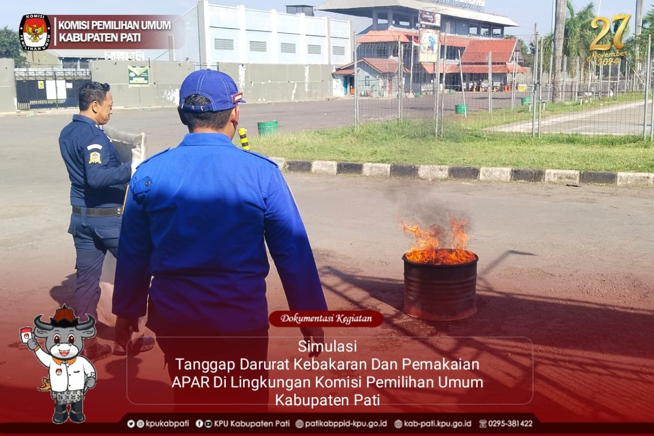 KPU Kabupaten Pati bekerjasama dengan Pemadam kebakaran Kabupaten Pati mengadakan Simulasi Tanggap Darurat Kebakaran Dan Pemakaian APAR Di Lingkungan Komisi Pemilihan Umum Kabupaten Pati. Simulasi ini dimaksudkan agar seluruh sumber daya yang ada di KPU Kabupaten Pati memahami dan tanggap dan antisipatif terhadap potensi kebakaran yang ada di kantor KPU Kabupaten Pati.