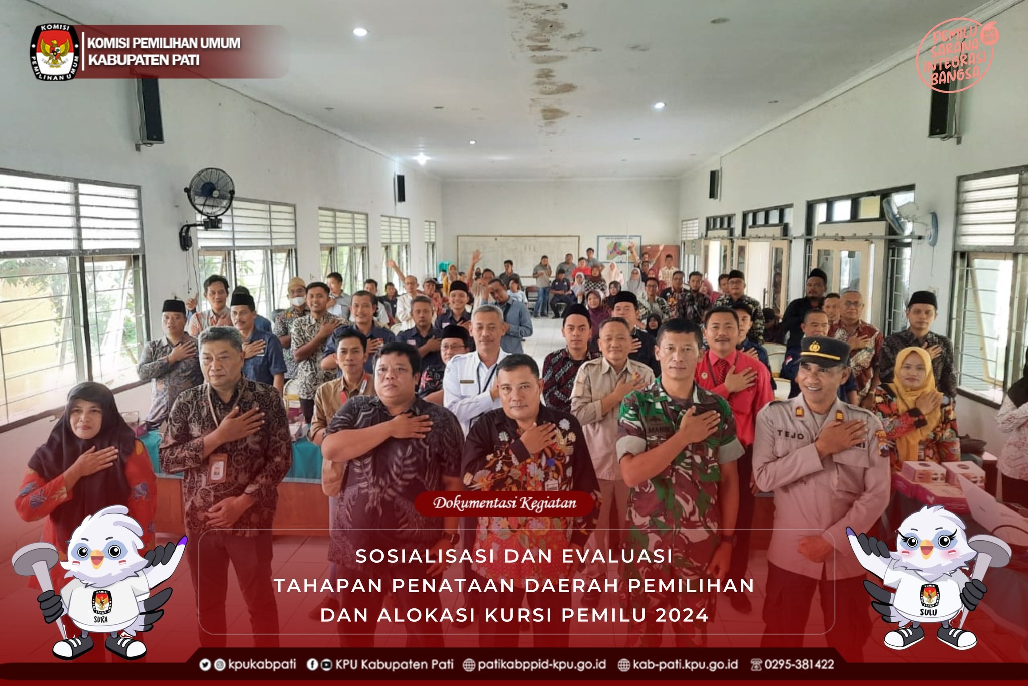 KPU Kabupaten Pati melaksanakan Sosialisasi dan Evaluasi Tahapan Penataan Daerah Pemilihan dan Alokasi Kursi Pemilu 2024. Hadir dalam kegiatan tersebut Ketua dan Anggota KPU, Sekretaris KPU, Forkopincam, Koramil, Kapolsek, Camat, PPK, dan perwakilan tokoh masyarakat. Kegiatan bertempat di Aula Kecamatan Cluwak, dimulai Pukul 10.00 WIB. (27/4)