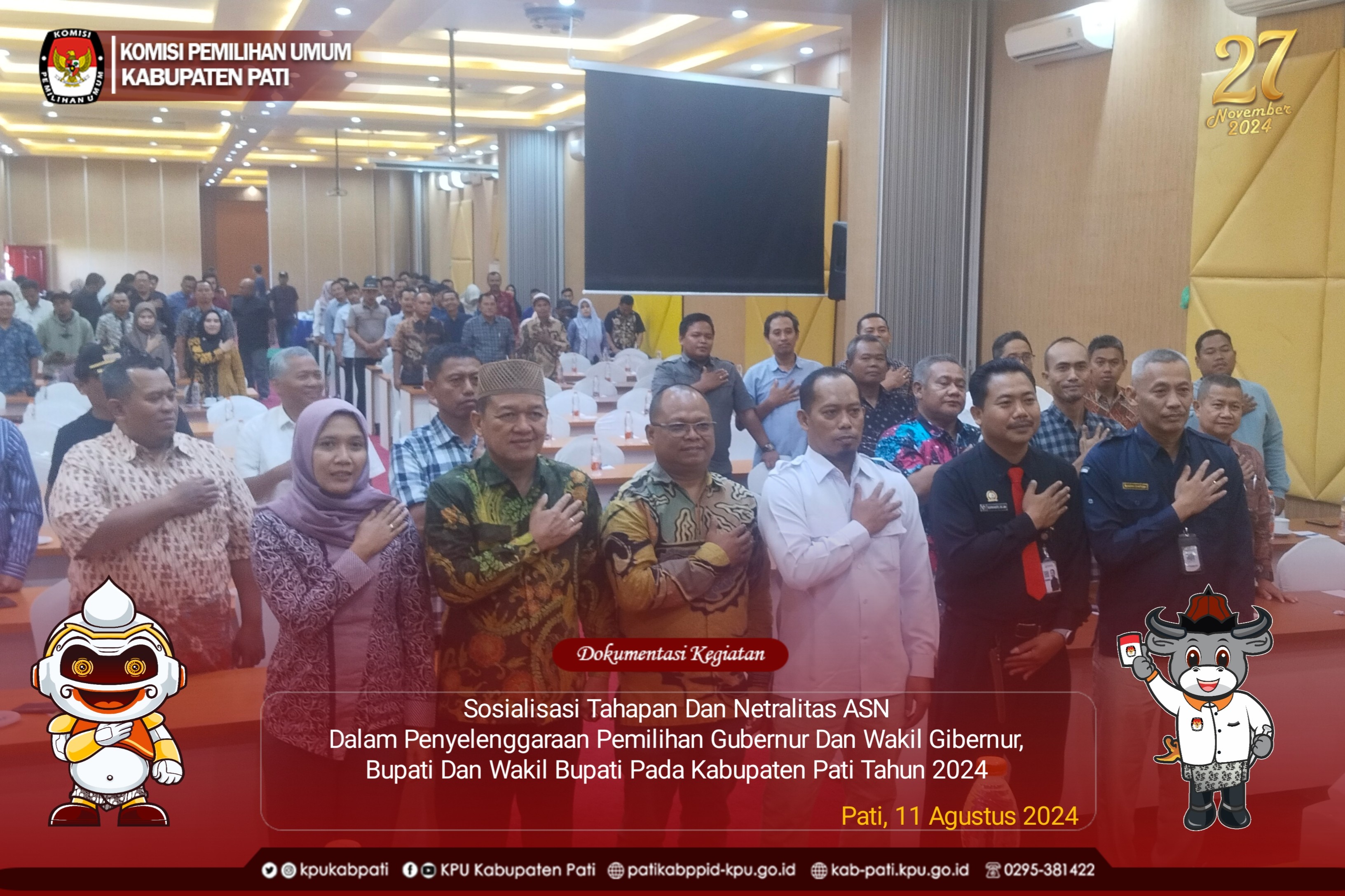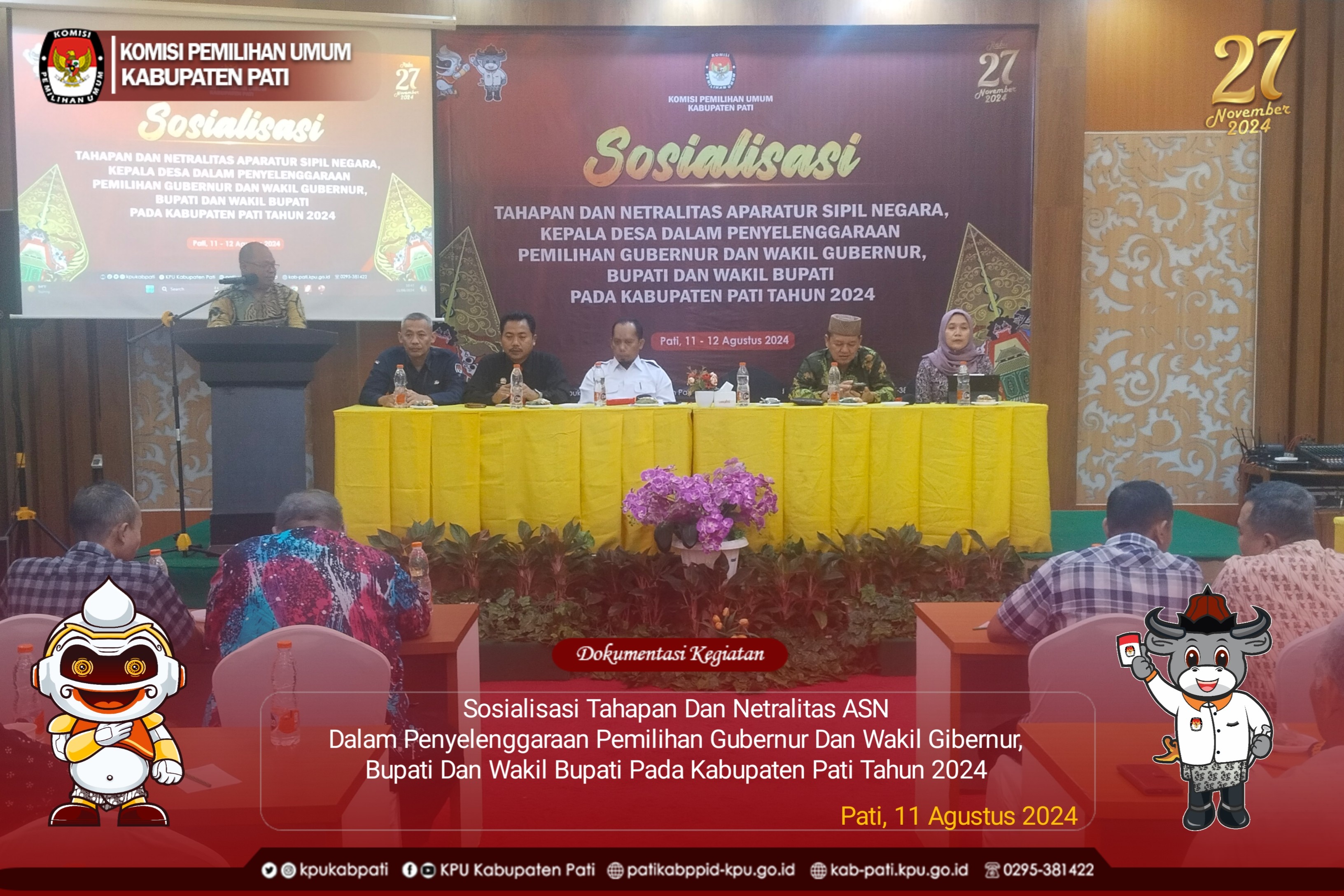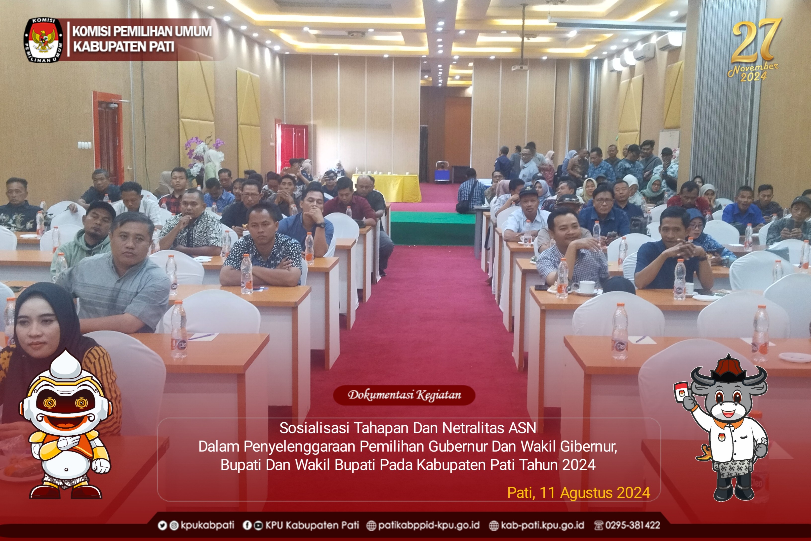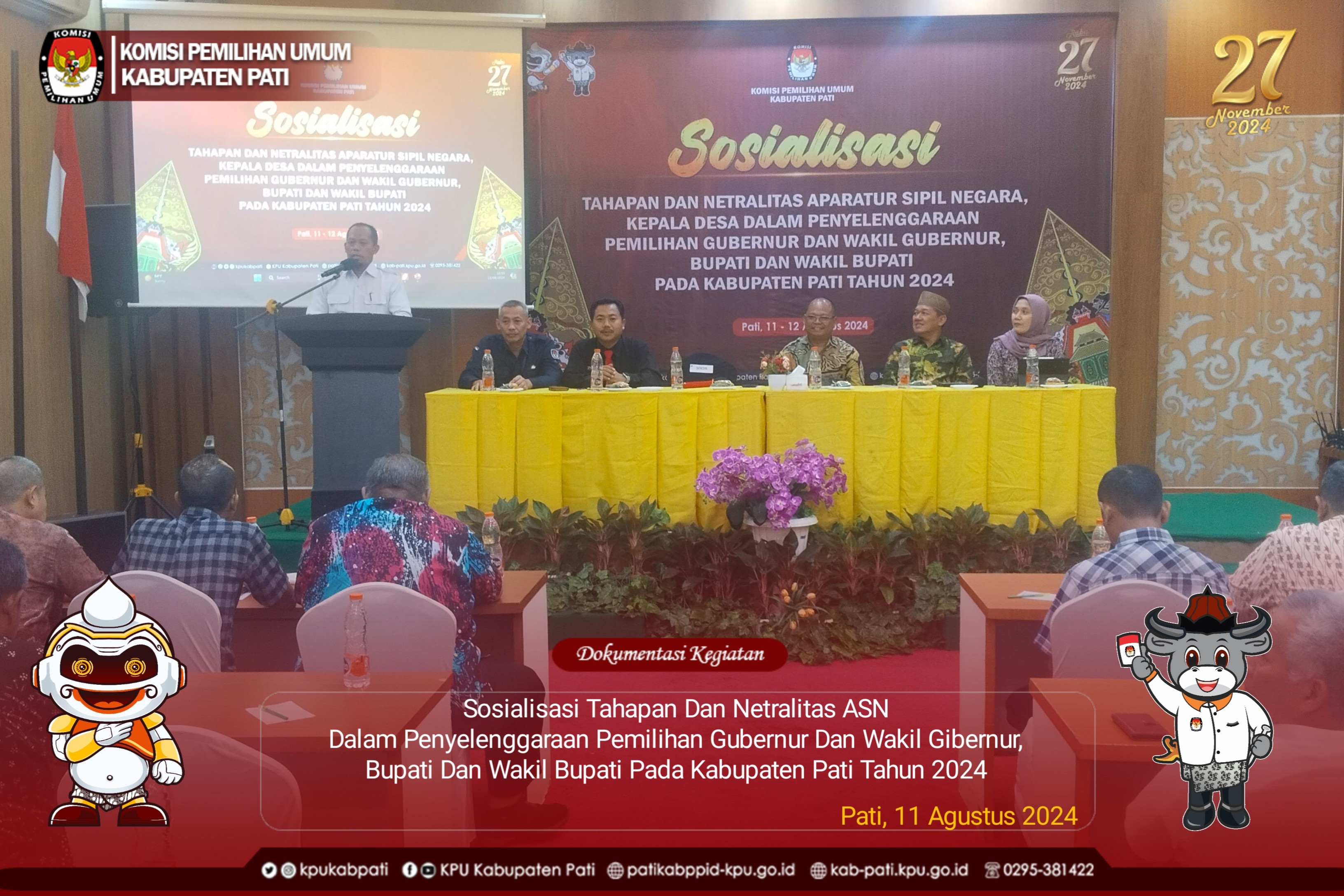 KPU Kabupaten Pati menyelenggarakan kegiatan Sosialisasi Tahapan dan Netralitas ASN dan Kepala Desa dalam Pemilihan Gubernur dan Wakil Gubernur, Bupati dan Wakil Bupati pada Kabupaten Pati Tahun 2024 yang diselenggarakan pada Hari minggu dan senin tanggal 11 dan 12 Agustus 2024