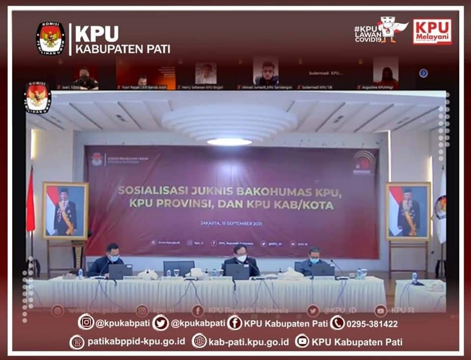 KPU Kabupaten Pati mengikuti Sosialisasi Juknis Bakohumas KPU, KPU Provinsi dan KPU Kab/Kota secara daring, Rabu (15/09). Dalam kegiatan yang diselenggarakan oleh KPU RI ini hadir sebagai Narasumber Anggota KPU RI, I Dewa Kade Wiarsa Raka Sandi; Praktisi Kehumasan, Anisha Dasuki; Kepala Biro Partisipasi dan Hubungan Masyarakat KPU RI, Cahyo Ariawan serta Moderator, Kepala Bagian Hubungan Masyarakat dan Informasi Publik KPU RI, Robby Leo. Membuka kegiatan ini, Ketua KPU RI, Ilham Saputra meminta jajarannya mampu dan bertanggung jawab dalam mengelola Bakohumas agar penyebaran informasi yang cepat, akurat dan berimbang dapat tercapai.