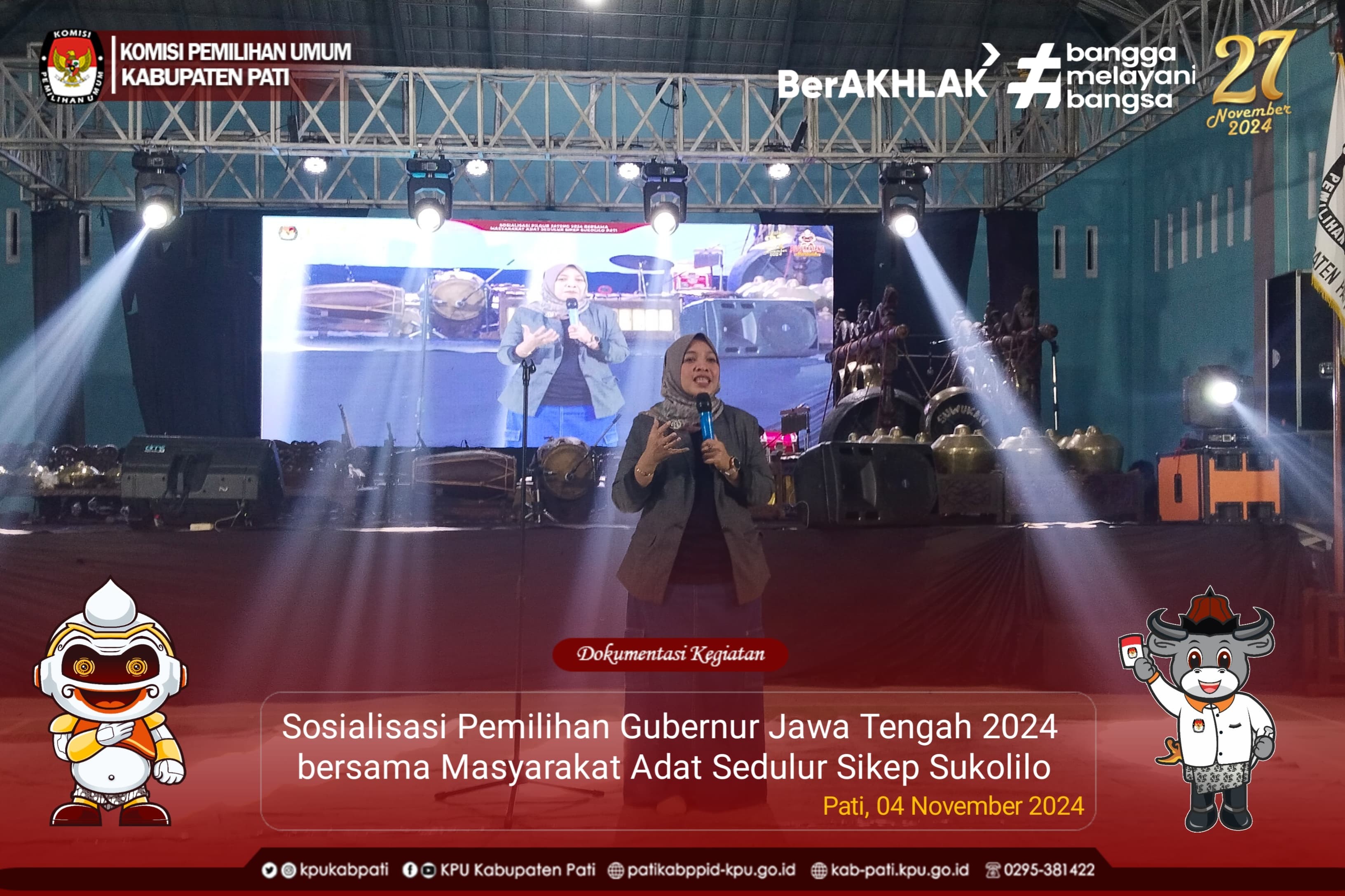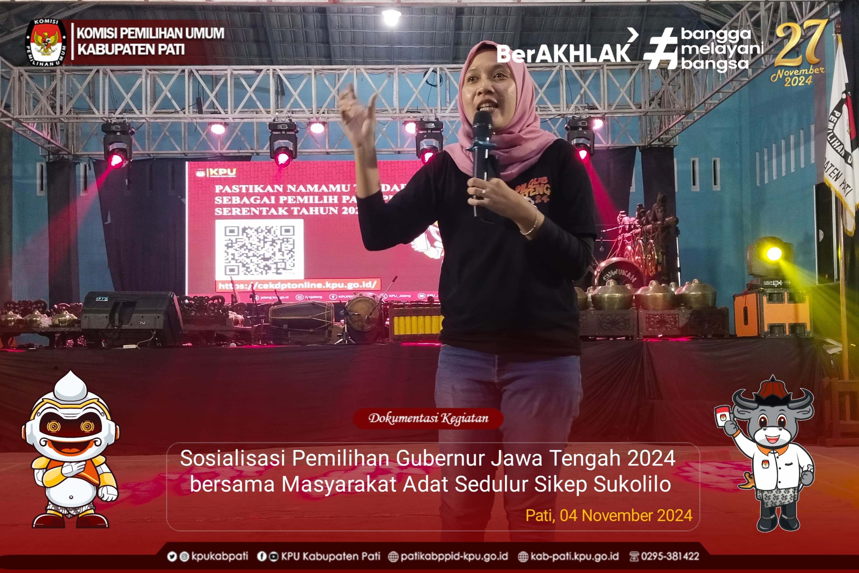 turut hadir juga segenap jajaran pimpinan komisioner dan sekretariat KPU Kabupaten Pati, Ibu Nugraheni yuliadhistiani, S.IP, M.M. seleaku divisi Sosialisasi , pendidikan Pemilih, Partisipasi Masyarakat dan SDM mensosialisasikan pentingnya sedulur sikep ikut berpartisipasi dama pemilihan Gubernur dan Wakil Gubernur 2024.