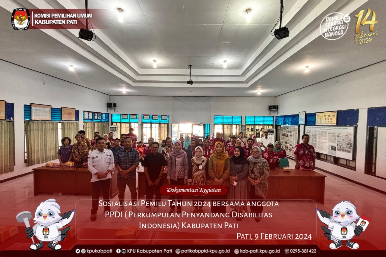 KPU Kabupaten Pati pada hari jumat 9 Februari 2024 bertempat di Aula KPU Kabupaten Pati mengadakan Sosialisasi Pemilu Tahun 2024 bersama anggota PPDI ( Perkumpulan Penyandang Disabilitas Indonesia) Kabupaten Pati.