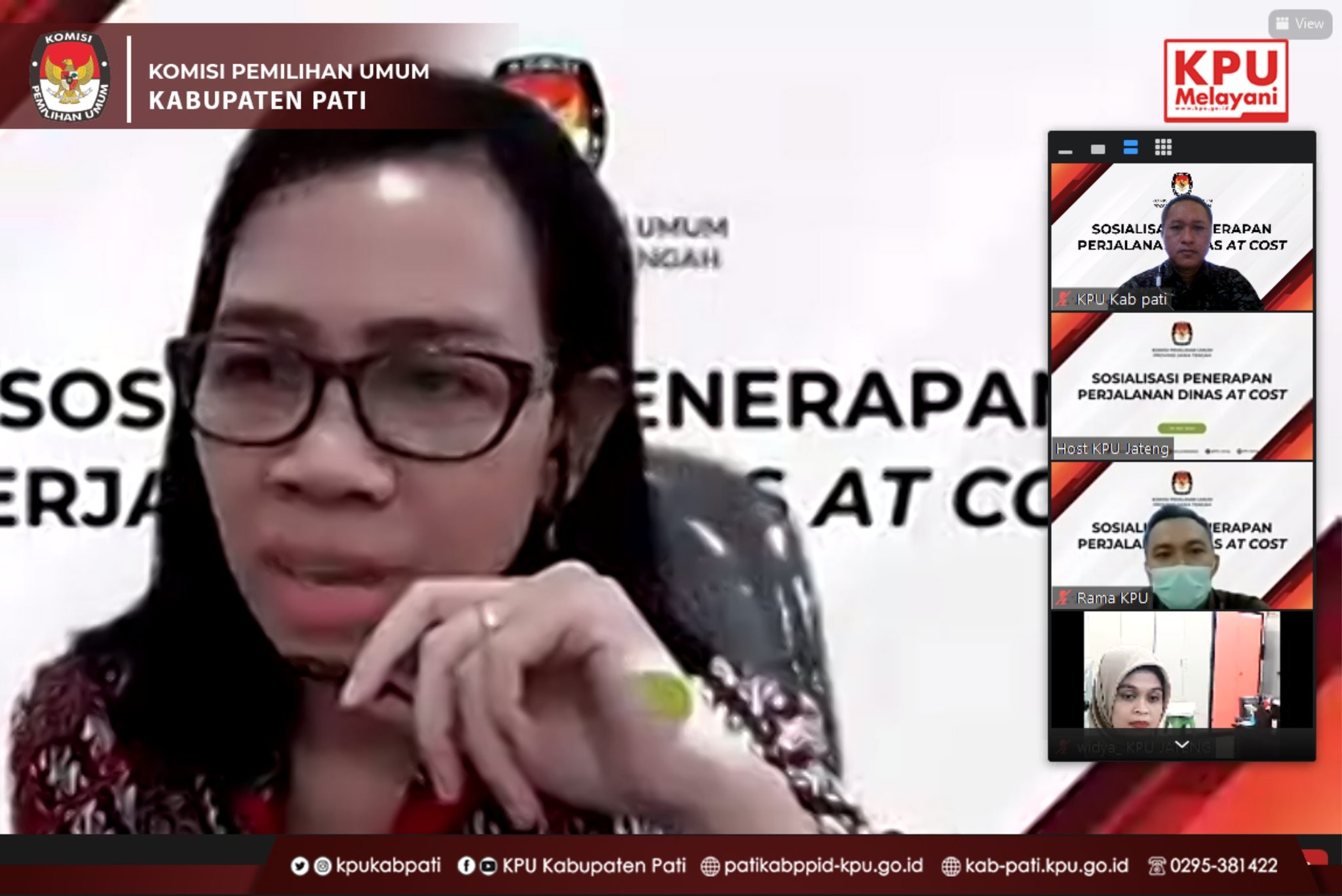 KPU Kabupaten Pati mengikuti kegiatan Sosialisasi Penerapan Perjalanan Dinas At Cost bagi KPU Provinsi dan KPU Kabupaten/Kota Se-Jawa Tengah. Kegiatan dilaksanakan melalui Zoom Meeting oleh KPU Provinsi Jawa Tengah. kegiatan dilaksanakan pada Jumat, 20 Mei 2022 Pukul 09.00 WIB.