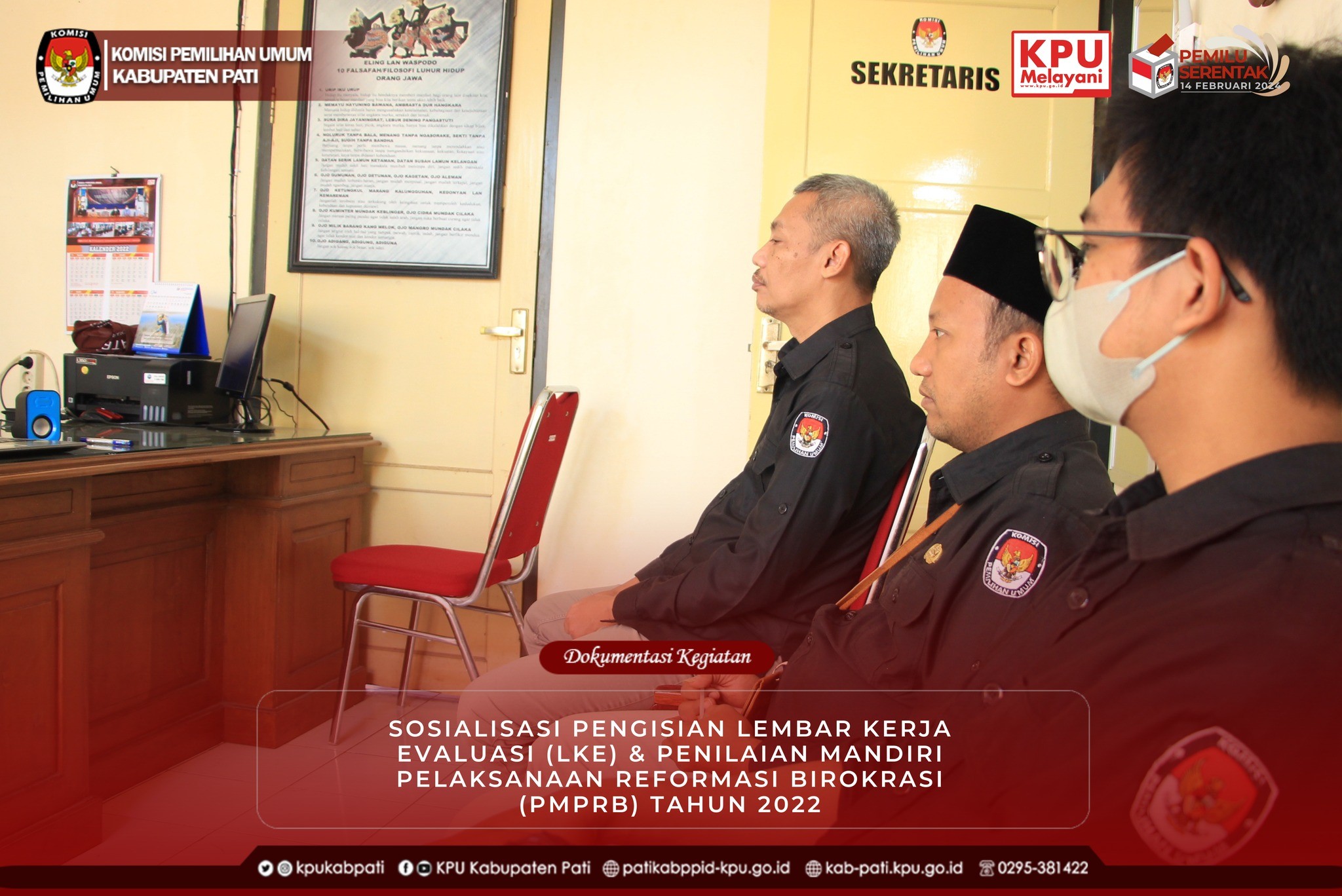 KPU Kabupaten Pati mengikuti sosialisasi Pengisian Lembar Kerja Evaluasi (LKE) Reformasi Birokrasi dan PMPRB 2022 melalui media daring. Kegiatan diselenggarakan oleh KPU Provinsi Jawa Tengah pada Rabu 27 Juli 2022 Pukul 09.00 WIB.