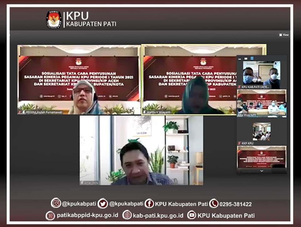 Jum'at (30/7), Sekretaris beserta Kasubag KPU Kabupaten Pati mengikuti kegiatan Sosialisasi Tata Cara Penyusunan Sasaran Kinerja Pegawai KPU Periode I Tahun 2021 di lingkungan Sekretariat KPU Provinsi/KIP Aceh dan Sekretariat KPU/KIP Kabupaten/Kota melalui zoom, pada kegiatan ini menghadirkan Narasumber dari Badan Kepegawaian Nasional Bapak Anjar.
