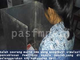 Komisi Pemilihan Umum (KPU) Kabupaten Pati menggelar simulasi pencoblosan Pemilihan Kepala Daerah (Pilkada) di Tempat Pemungutan Suara (TPS) kepada pelajar, Sabtu pagi (25/4). Simulasi tersebut merupakan bagian dari agenda KPU untuk mensosialisasikan UU No 8/2015 tentang Pemilu Kepala Daera (Pilkada).