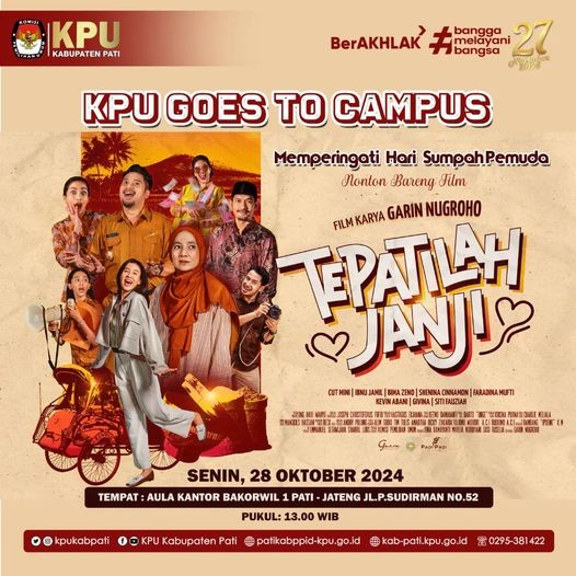 Dalam rangka memperingati Hari Sumpah Pemuda Tahun 2024, KPU Kabupaten Pati mengajak mahasiswa dan masyarakat untuk lebih dekat dengan dunia pemilihan dengan sarana Nonton Bareng Film "Tepatilah Janji"