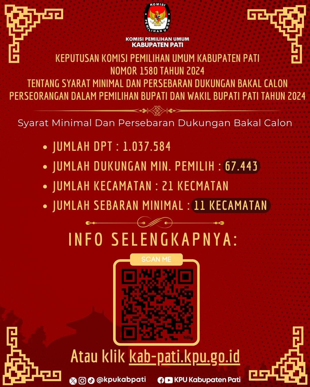 Berikut Keputusan Komisi Pemilihan Umum Kabupaten Pati Nomor 1580 Tahun 2024 Tentang Syarat Minimal Dan Persebaran Dukungan Bakal Calon Perseorangan Dalam Pemilihan Bupati Dan Wakil Bupati Pati Tahun 2024