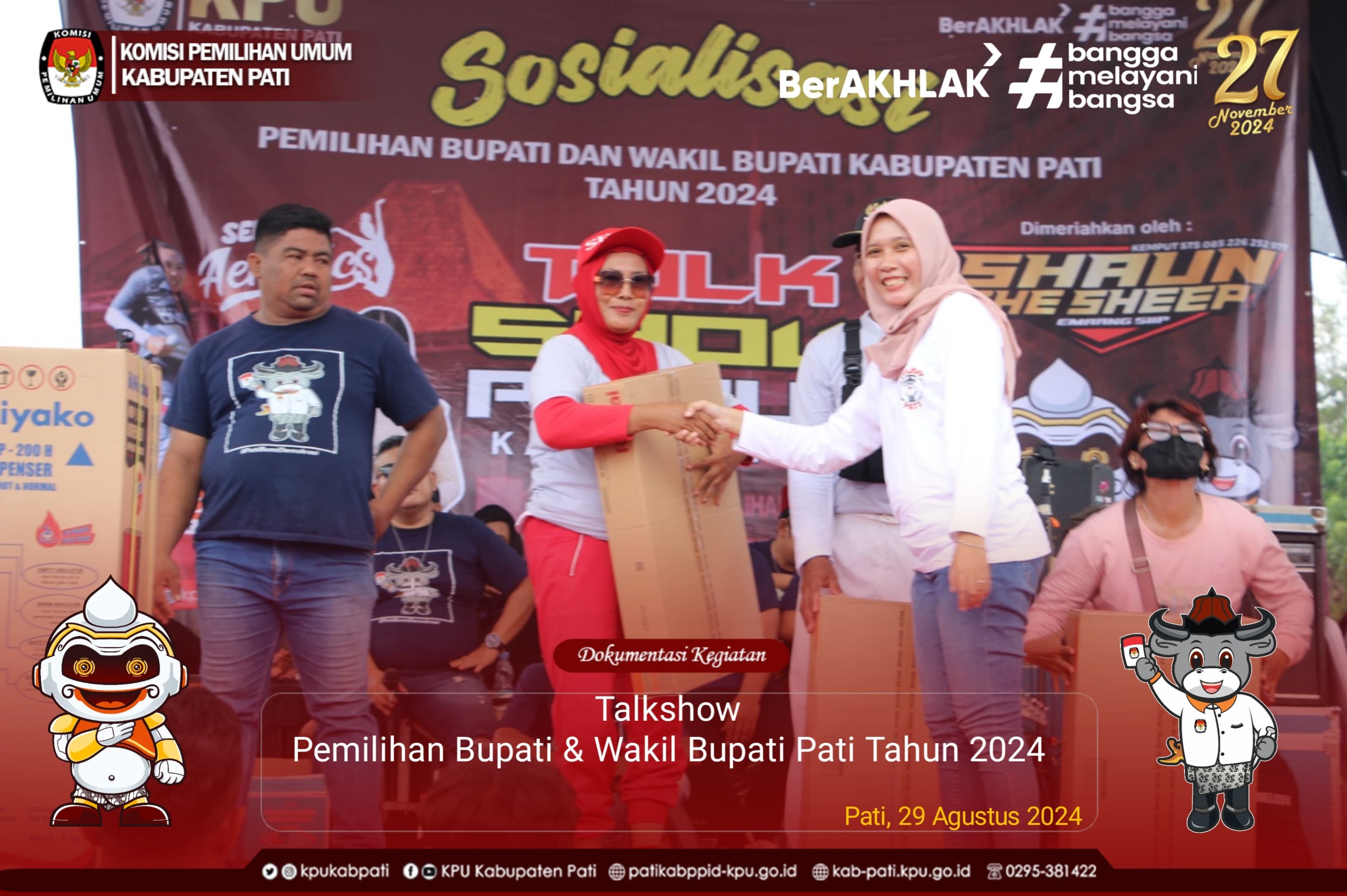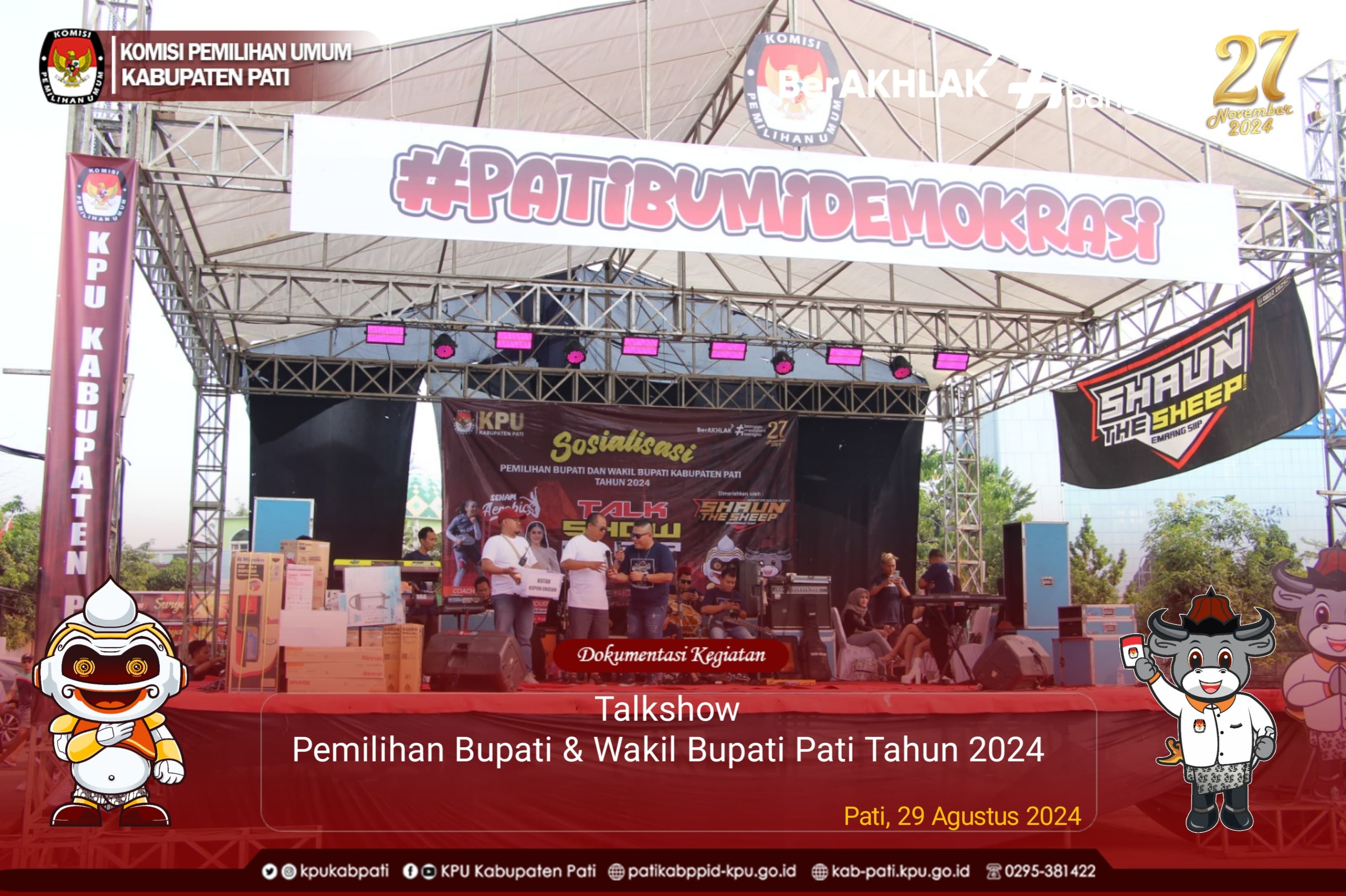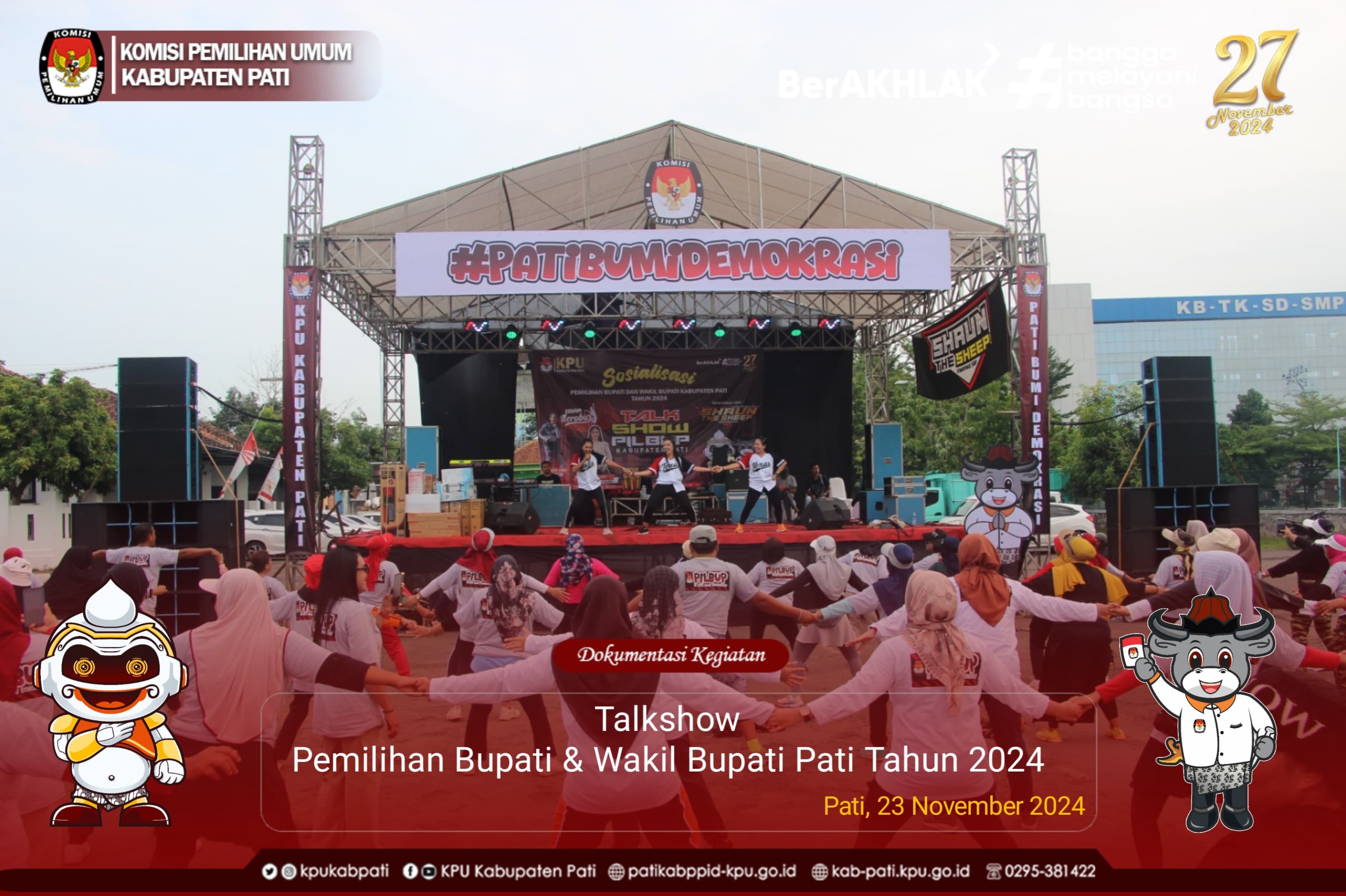 Sosialisasi dalam bentuk Talk Show itu sendiri berlangsung sangat meriah dengan menghadirkan nara sumber influencer Pati Karina Moudy,dalam talkshoew tersebut hadir juga nara sumber dari KPU kabupaten Pati Bapak Supriyanto A.Md. S.S dan juga komisioner KPU Kabupaten Pati divisi Sosialisasi, Pendidikan pemilih, partisipasi Masyarakat dan SDMrangkaian acara sendiridiawali dengan senam aerobik yang diikuti oleh masyarakat.