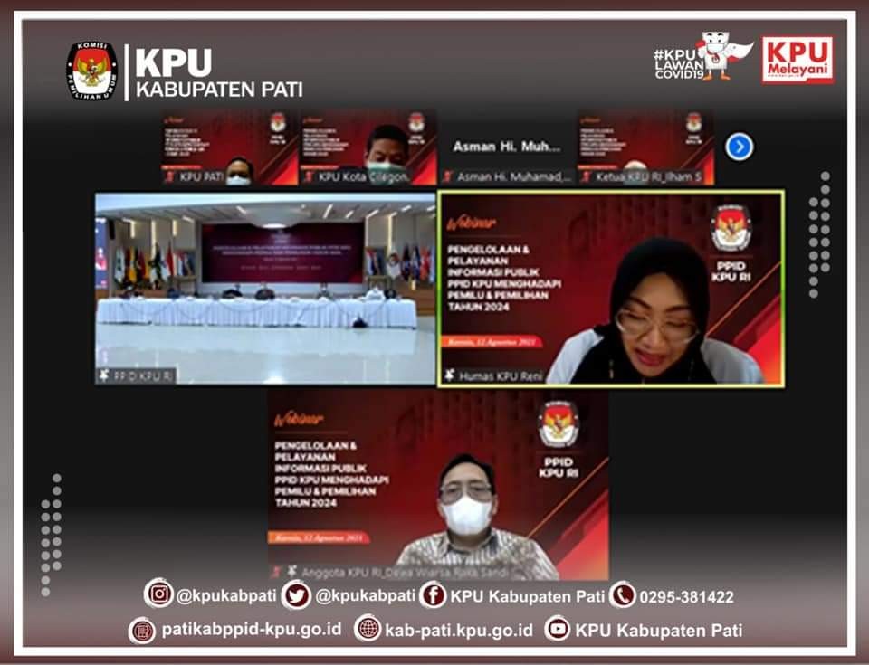 Kamis (12/8) pukul 13:00 WIB, KPU Kabupaten Pati mengikuti webinar yang diselenggarakan oleh KPU RI, dengan tema Pengelolaan dan Pelayanan Informasi Publik PPID KPU Menghadapi Pemilu dan Pemilihan 2024 Mengacu Peraturan Komisi Informasi Nomor 1 Tahun 2019.