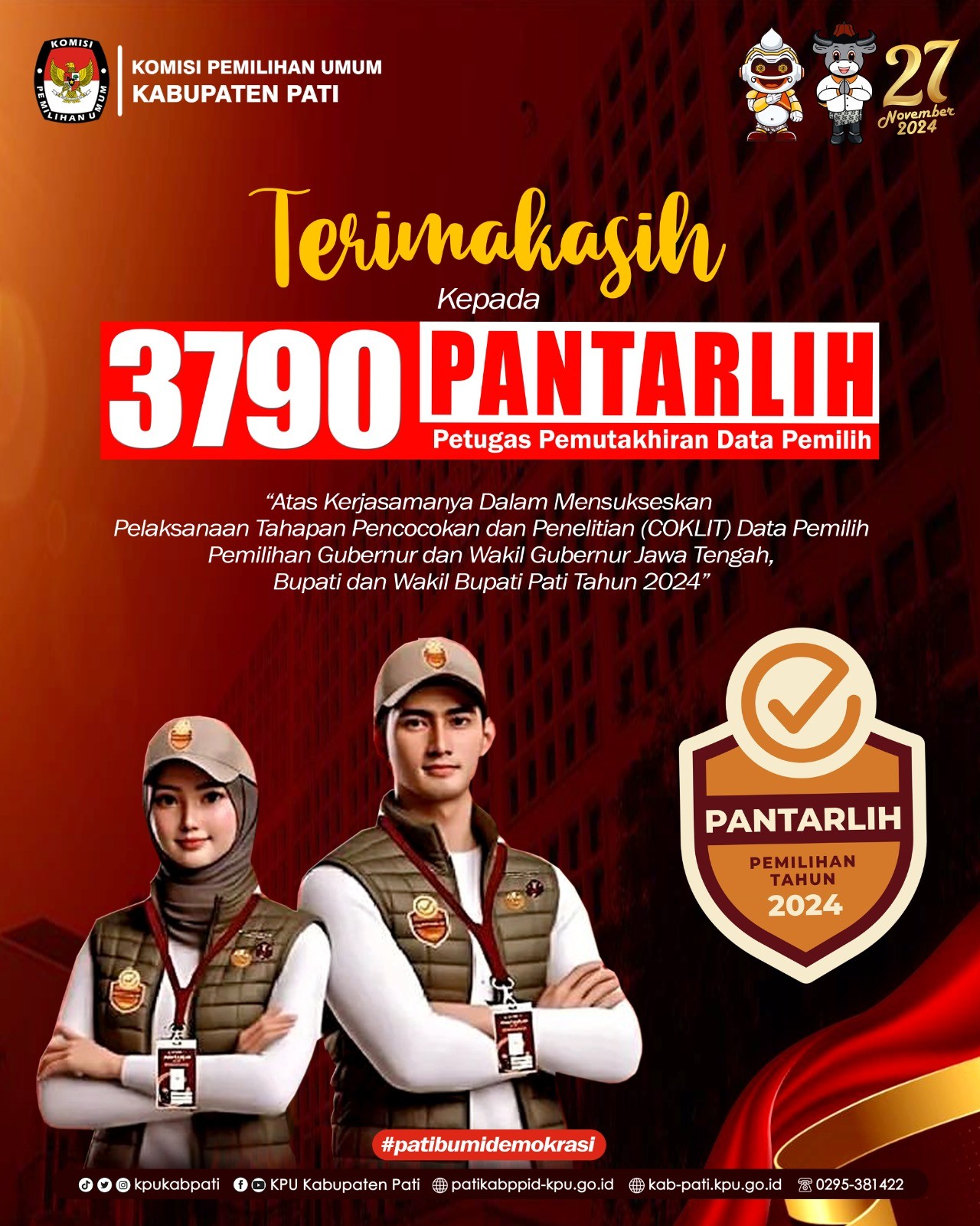 kami ucapkan Terimakasih kepada 3790 Petugas Pemutakhiran data pemilih (Pantarlih) atas kerjasamanya dalam mensukseskan tahapan Pelaksanaan Tahapan Pencocokan dan Penelitian (COKLIT) Data Pemilih Pemilihan Gubernur dan Wakil Gubernur Jawa Tengah , Bupati Dan Wakil Bupati Pati Tahun 2024.