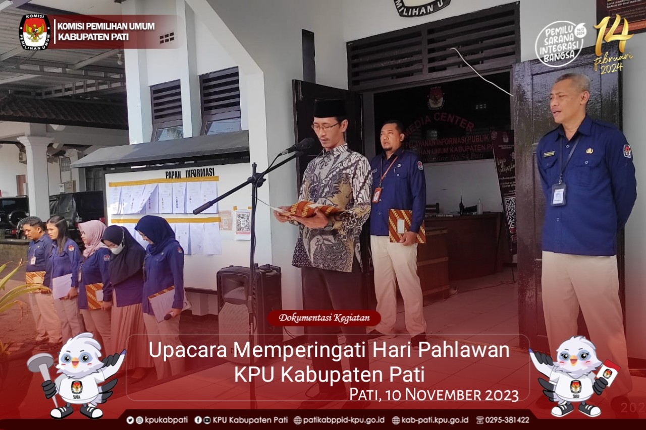 Segenap jajaran KPU Kabupaten Pati melaksanakan Upacara dalam rangka memperingati Hari Pahlawan 10 November. Bertindak sebagai Pembina Upacara Bapak Haryono, S. H.I, M.S.I. selaku Divisi Hukum dan Pengawasan.Upacara yang dilaksanakan dengan penuh hikmah ini memberi pesan kepada kita semua agar meneladani jasa para pahlawan dengan bekerja sepenuh hati demi bangsa dan negara.