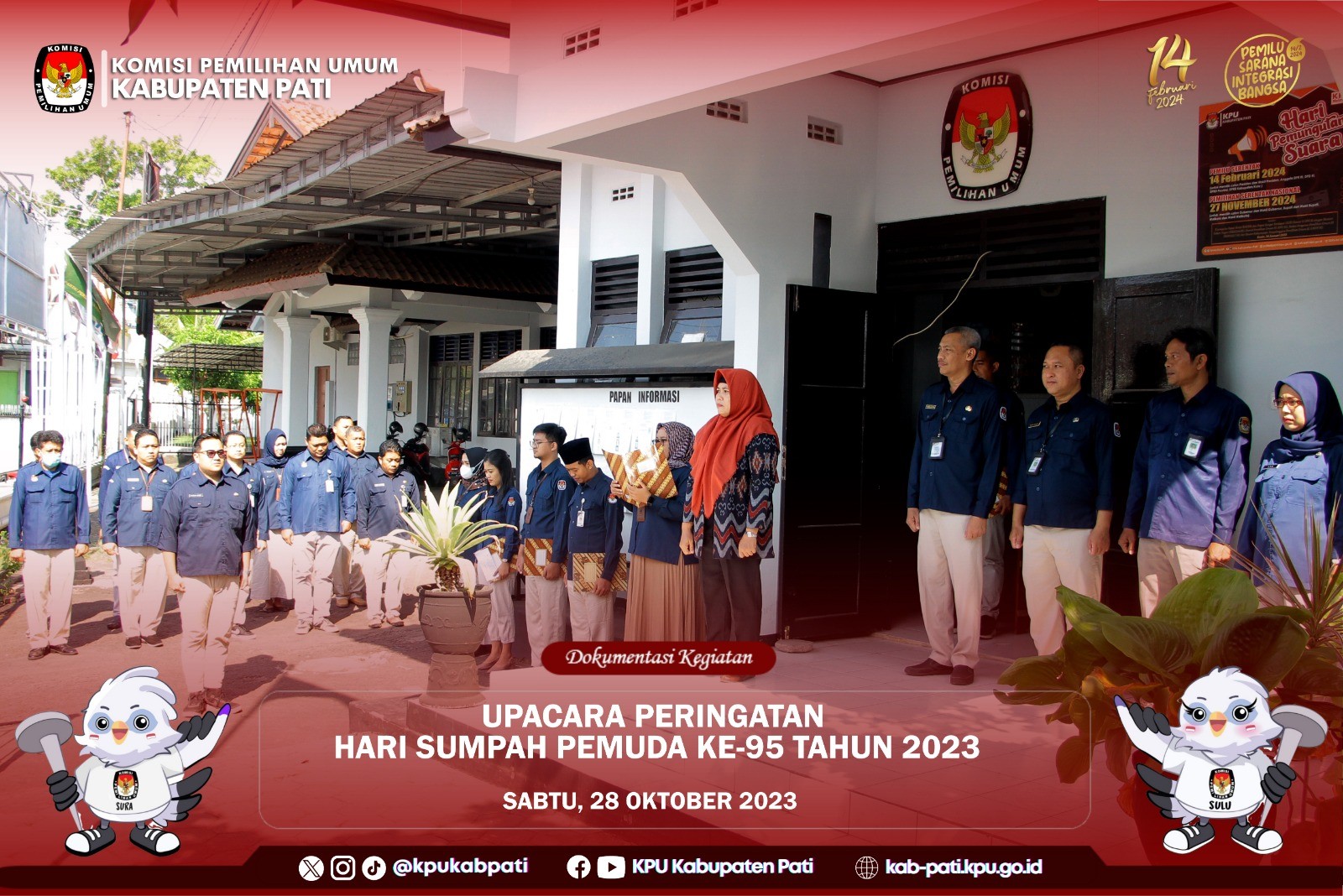 KPU Kabupaten Pati menyelenggarakan upacara peringatan hari sumpah pemuda ke-95 pada tahun 2023. Sebagai Pembina Upacara Divisi Perencanaan Data dan Informasi Khoirun Nikmah, dan Staf TPP dan Hupmas Fikrian Akbar sebagai Pemimpin Upacara. (28/10)