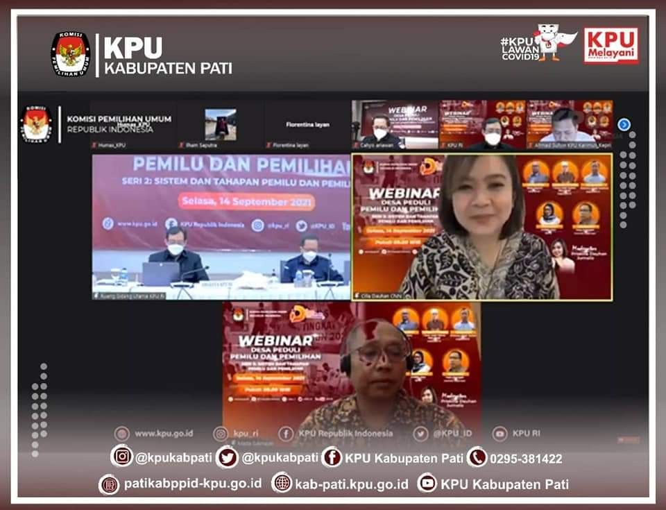 KPU Kabupaten Pati mengikuti Webinar Desa Peduli Pemilu dan Pemilihan Seri 2, Selasa (14/9). Dibuka Ketua KPU RI Ilham Saputra, kegiatan ini membahas Sistem dan Tahapan Pemilu dan Pemilihan sebagai ruang memperoleh masukan dari banyak pihak menghadapi dimulainya tahapan pada 2022 mendatang. Hadir sebagai narasumber, Anggota KPU RI Pramono Ubaid Tanthowi, Mada Sukmajati (UGM), serta Dahliah Umar (Netfid).