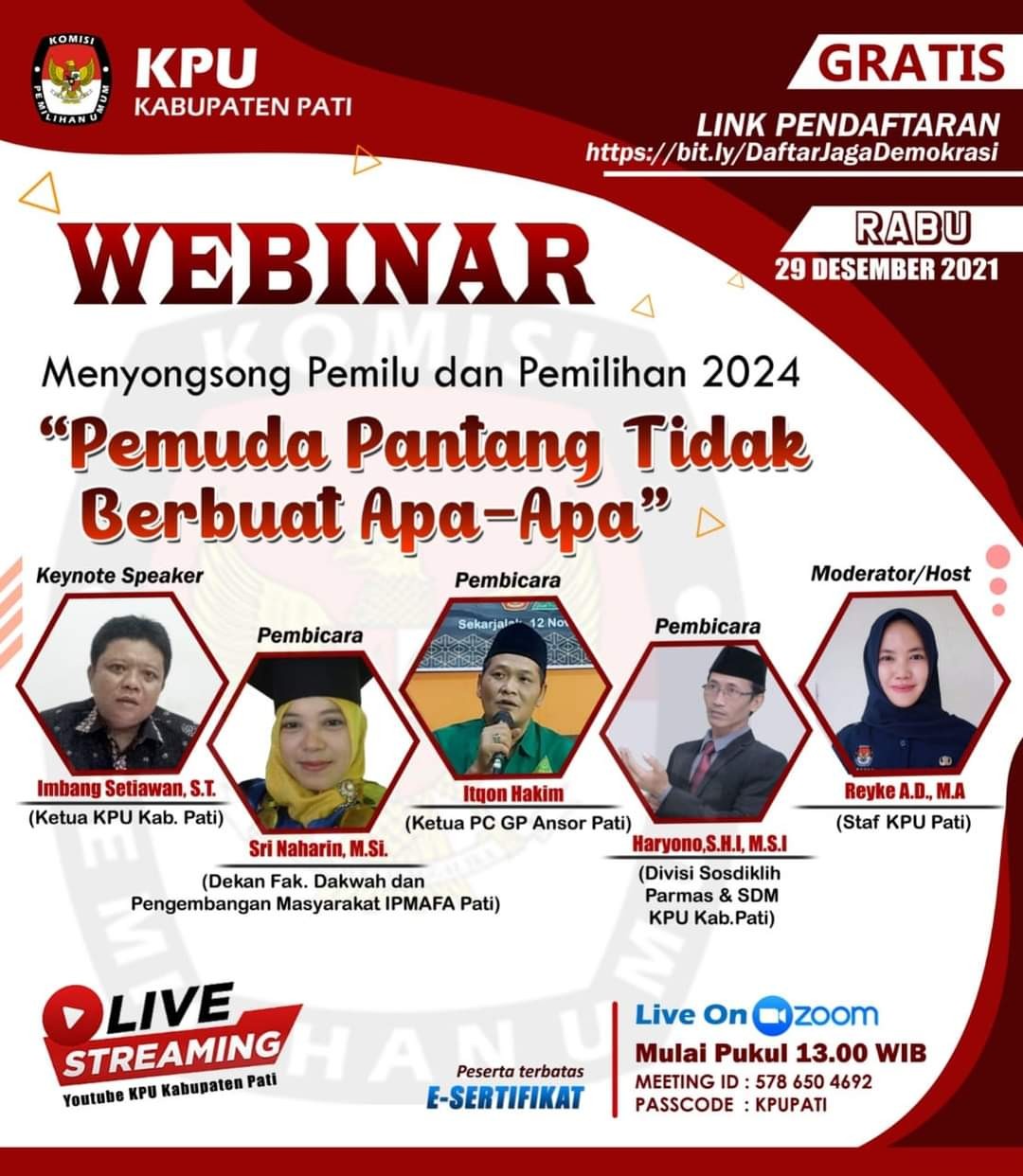 #TemanPemilih, Ayo ikuti Webinar Menyongsong Pemilu dan Pemilihan 2024 dengan tema Pemuda Pantang Tidak Berbuat Apa-Apa. Hari Rabu 29 Desember 2021 mulai pukul 13.00 WIB. Hanya di kanal youtube KPU Kabupaten Pati.
