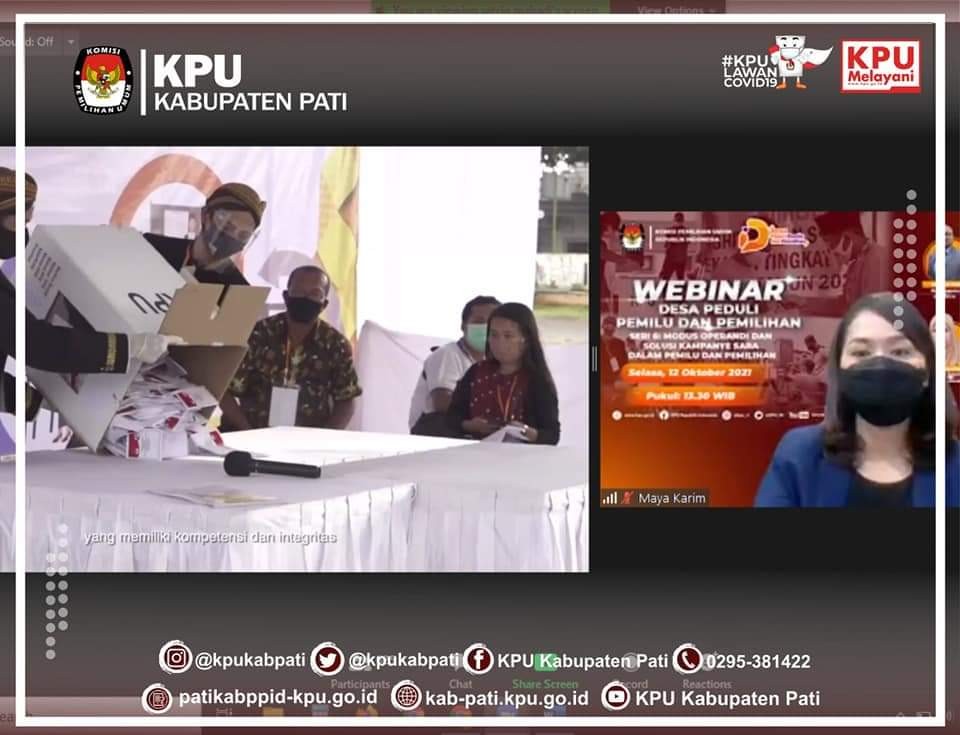 KPU Kabupaten Pati mengikuti webinar seri ke 6 (enam) dengan tema "Modus Operandi dan Solusi Kampanye SARA dalam Pemilu dan Pemilihan" secara online pada Selasa, 12 Oktober 2021 pukul 13.30 WIB s.d selesai. Acara yang diselenggarakan oleh KPU RI ini masih dalam rangka memperkenalkan, menggaungkan dan melaksanakan diseminasi Informasi seputar Program Desa Peduli dan Pemilihan secara luas kepada masyarakat.