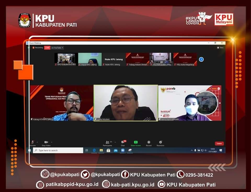 Rabu (17/11), KPU Kabupaten Pati mengikuti Webinar "Teknik Penyusunan Prosedur Standar Operasional dan Peta Proses Bisnis” yang diselenggarakan oleh KPU Provinsi Jawa Tengah pukul 13:30 WIB. Acara ini diikuti oleh KPU Kabupaten/Kota se Jawa Tengah dengan narasumber Pejabat pada Deputi Bidang Kelembagaan dan Tata Laksana Kementerian Pendayagunaan Aparatur Negara dan Reformasi Birokrasi Fahrul Azmi.