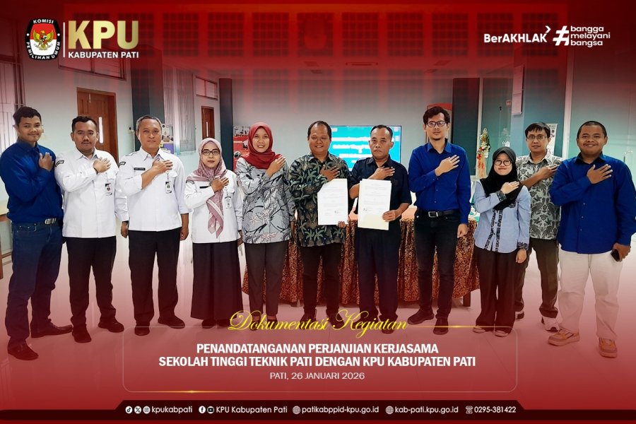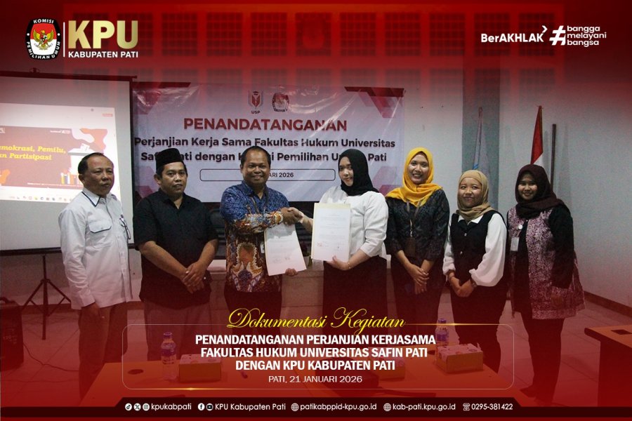 Komisi Pemilihan Umum (KPU) Kabupaten Pati melakukan Penandatanganan Kerjasama (PKS) dengan Fakultas Hukum Universitas Safin Pati (USP) Rabu, 21/01/26.