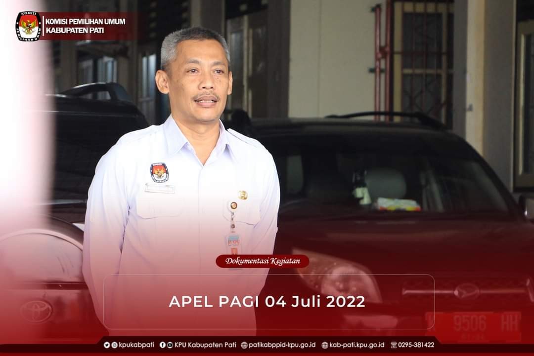 KPU Kabupaten Pati mengawali kegiatan hari Senin (27/6) dengan apel pagi pukul 08:00 WIB. Apel dipimpin oleh Anggota KPU Kabupaten Pati Divisi Hukum dan Pengawasan Ibu Sunarsih, S.Ag., M.H.. selaku pembina apel dan Kasubbag Teknis Penyelenggaraan Pemilu, Partisipasi dan Hubungan Partisipasi Masyarakat Bapak Deddy Pirngadi, S.T.. selaku komandan apel.
