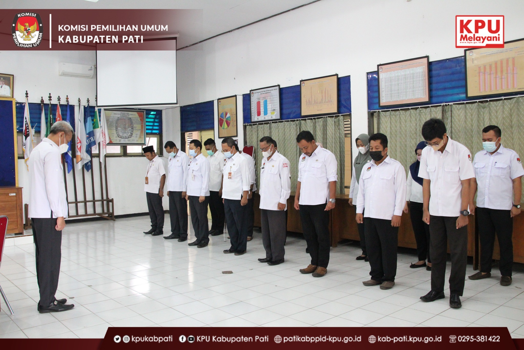 Apel diikuti oleh Komisioner KPU, Pejabat Struktural dan seluruh pegawai di lingkungan KPU Kabupaten Pati. Apel dilaksanakan dengan tetep mematuhi protokol kesehatan.