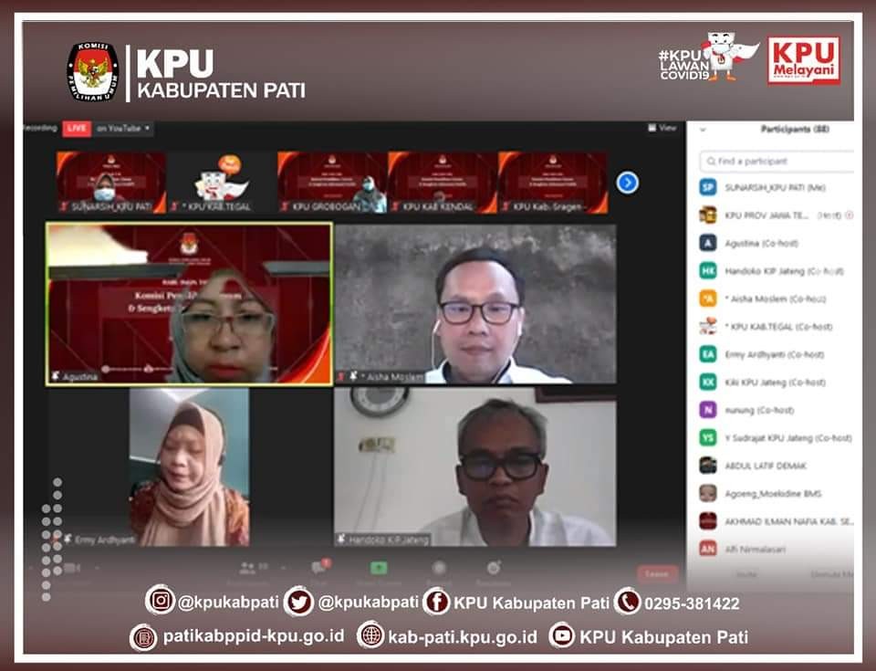Jum'at (27/8), KPU Kabupaten Pati mengikuti kegiatan zoom meeting yang diadakan oleh KPU Kabupaten Tegal pada kegiatan ini membahas Draf Peraturan KPU Pendaftaran, Verifikasi dan Penetapan Partai Politik Peserta Pemilu Tahun 2024 dan Pedoman Pendaftaran, Penelitian Administrasi, Verifikasi Faktual, dan Penetapan Partai Politik Peserta Pemilihan Umum Anggota DPR, DPRD Prov dan DPRD Kab/Kota Nomor: 174/HK.03.1-Kpt/03/KPU/X/2017 pada kegiatan ini KPU Kabupaten Pati tergabung dengan kelompok A yaitu Cilacap, Banjarnegara, Kota Magelang, Sukoharjo, Klaten dan Tegal dengan materi kajian Pendaftaran Partai Politik Peserta Pemilu.