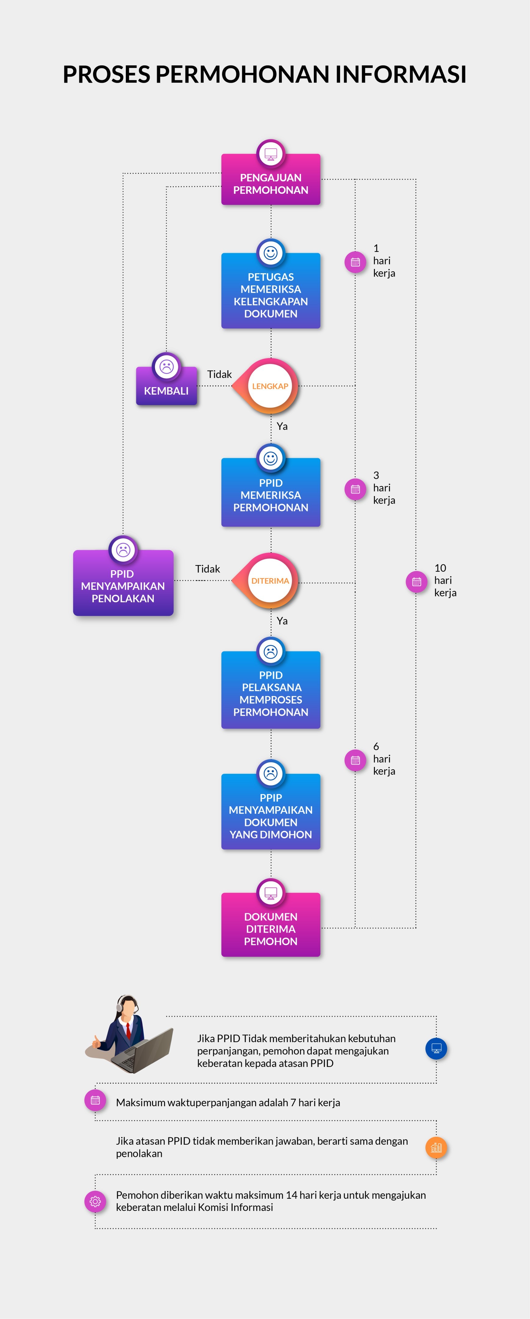 1. Waktu penyelesaian dilaksanakan paling lambat 10 (sepuluh) hari kerja sejak diterimanya permintaan, Pejabat Pengelola Informasi dan Dokumentasi (PPID) Pembantu akan menyampaikan pemberitahuan yang berisikan informasi yang diminta berada dibawah penguasaannya atau tidak. PPID pembantu dapat memperpanjang waktu paling lambat 7 (tujuh) hari kerja;
